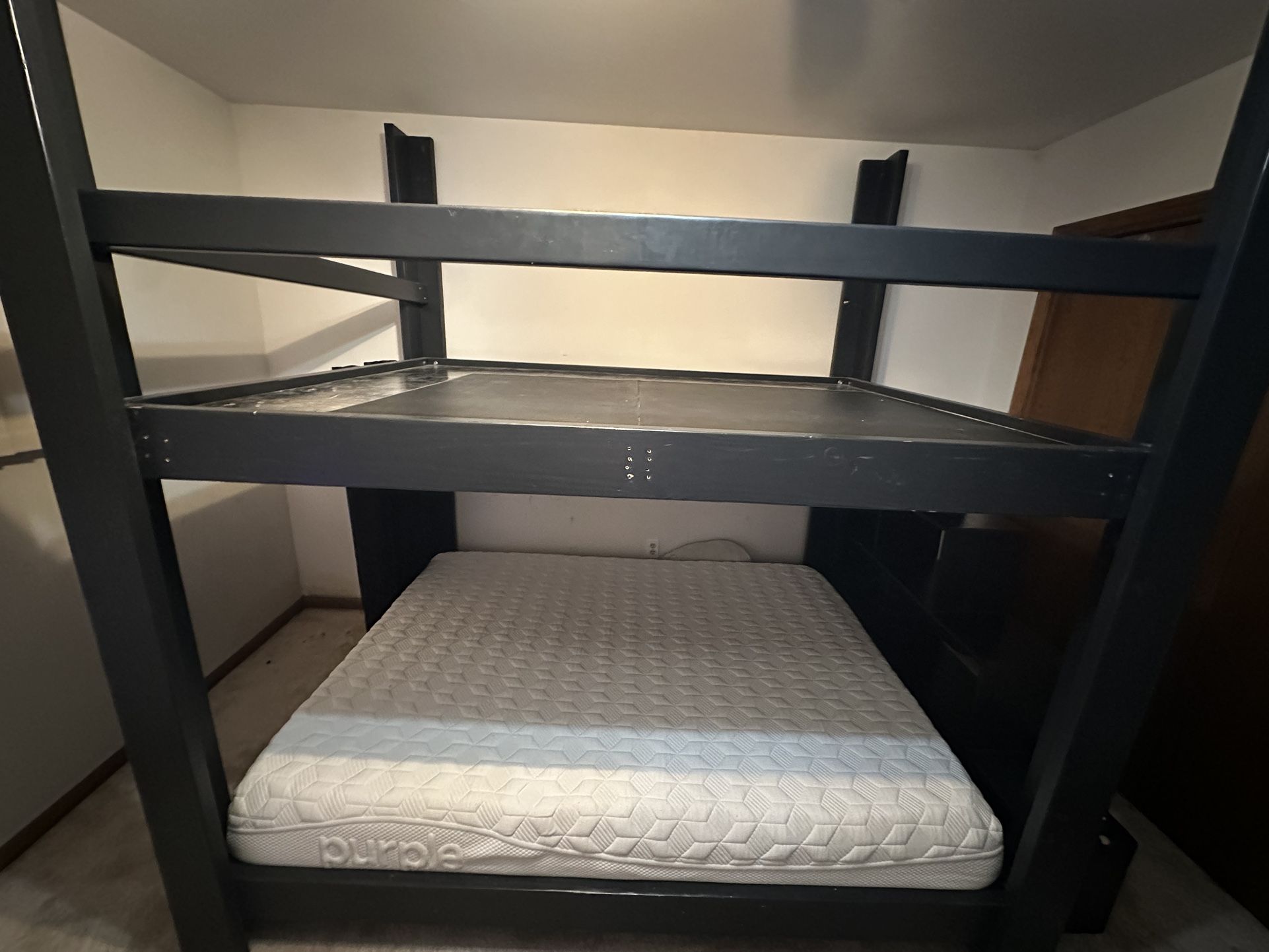 This is the coolest bed you’ll ever own! I don’t even want to sell it but my son wants to remodel and do something different in his room. We are only the second owner. This is a one of a kind, handmade, queen over queen bunk bed! It’s very heavy solid wood! You will never find another bed of this quality for this price! It can hold a lot of weight and will hold its ground to even the most destructive children. 😅 There are curtain rods for curtains to go around the bottom bunk. Mattress not included. You can either use as a bunk bed or use as one bed plus a play area or toy storage on top! There’s some Knicks and scratches here and there but otherwise great condition! It’s already disassembled and ready to go to its new home. Can help with moving/delivery if within 20 miles radius of Wilmot. Dimensions: Overall height is 7’10” second bed is 5’ and safety rail is 6’. The bed is 86” long plus 11 1/4” with the stairs/shelves.