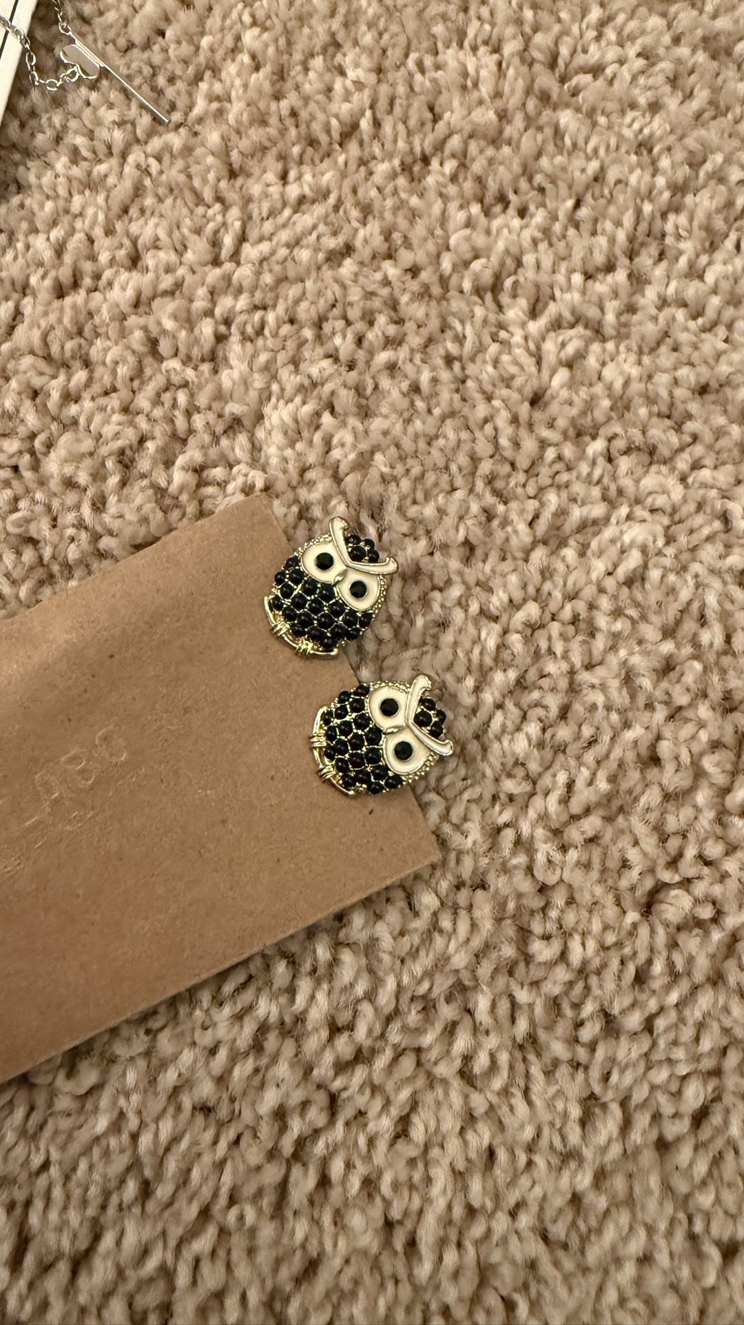 Intricate owl stud earrings with black crystals and gold-tone detailing. Classic vintage look. Very sturdy and eye-catching.