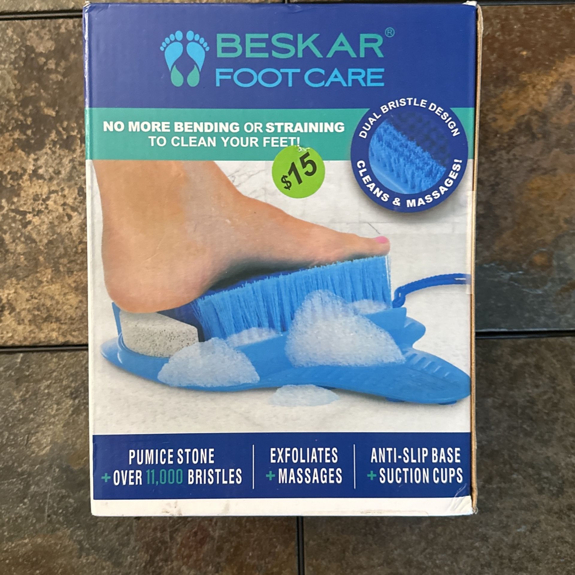No more bending or straining to clean your feet. This is great for everyone! Dry, cracked skin can be itchy and irritating. Good exfoliation can help reduce calluses. Over 11,000 infused bristles on your feet. This is brand new in the box, I don’t think it’s ever been open. I’m selling for $15.