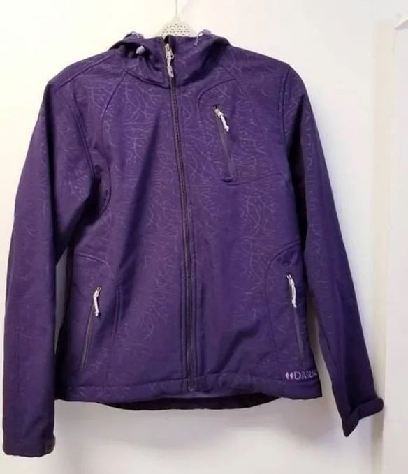 Double Diamond Wm M Ski Snowshoe Snowboard Performance Soft Shell Hooded Jacket. Purple Embossed Waterproof breathable outer shell and a cozy fleece lining make this jacket as attractive as it is functional. Ideal performance outer layer for active sports like snowshoeing, hiking, downhill and cross country skiing, great everyday wear in cold or wet weather. 3 zip outer pockets and two inner pouch pockets, adjustable Velcro cuffs, adjustable hem to keep out the cold. Hood is adjustable in the front and in the back. In excellent preowned condition no visible defects. Women’s Medium.