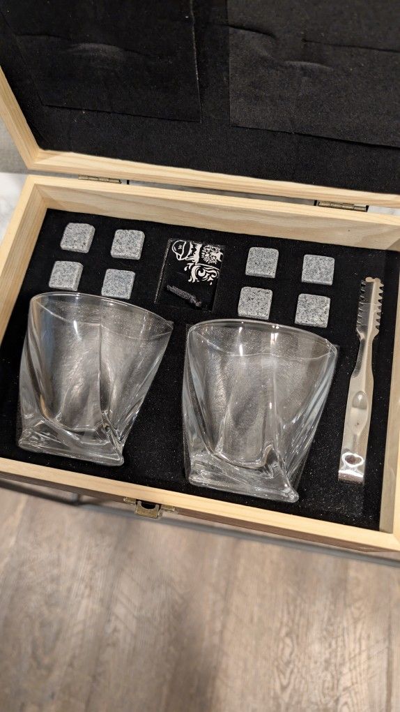BRAND NEW!! THE PERFECT WHISKEY GIFT SET - For a luxury whiskey experience, this set includes 2 diamond glass, 8 chilling whisky stones, a black velvet storage bag, 2 slate coasters, a steel tong, and a wooden gift box. The whiskey chilling stones are made of natural granite and are washable and reusable.