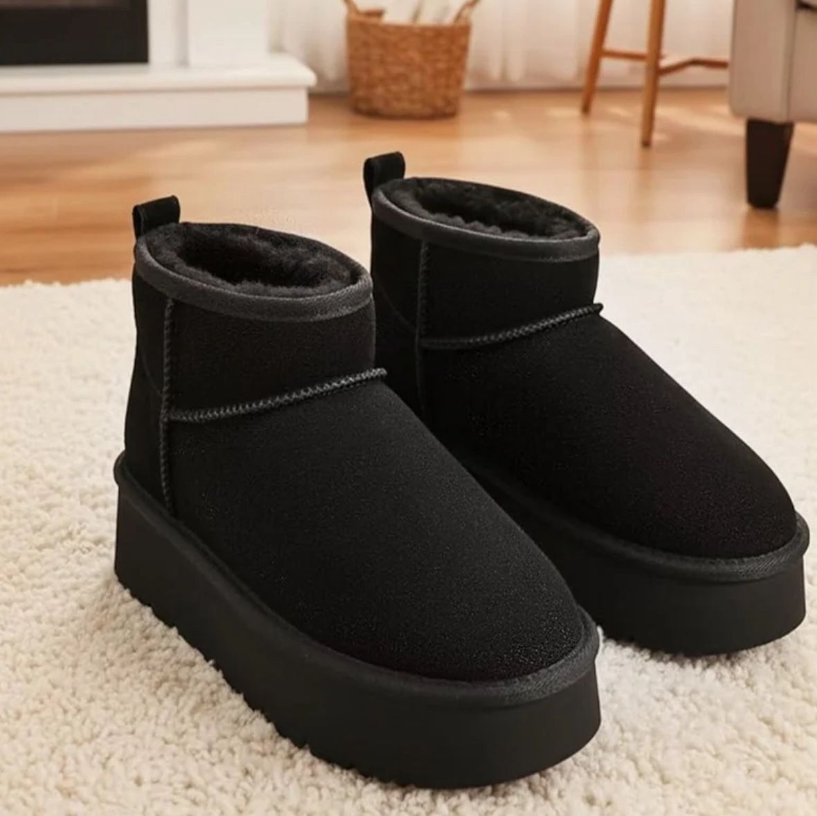 Black suede platform ankle boots in size 8. Warm, cozy, and stylish. Made with genuine suede and a soft fleece lining for comfort and insulation. The non-slip sole provides great traction and stability. Color: Black Size: 8 Material: Genuine suede with fleece lining Condition: NEW IN BOX Versatile short boot that pairs perfectly with jeans, leggings, or joggers.
