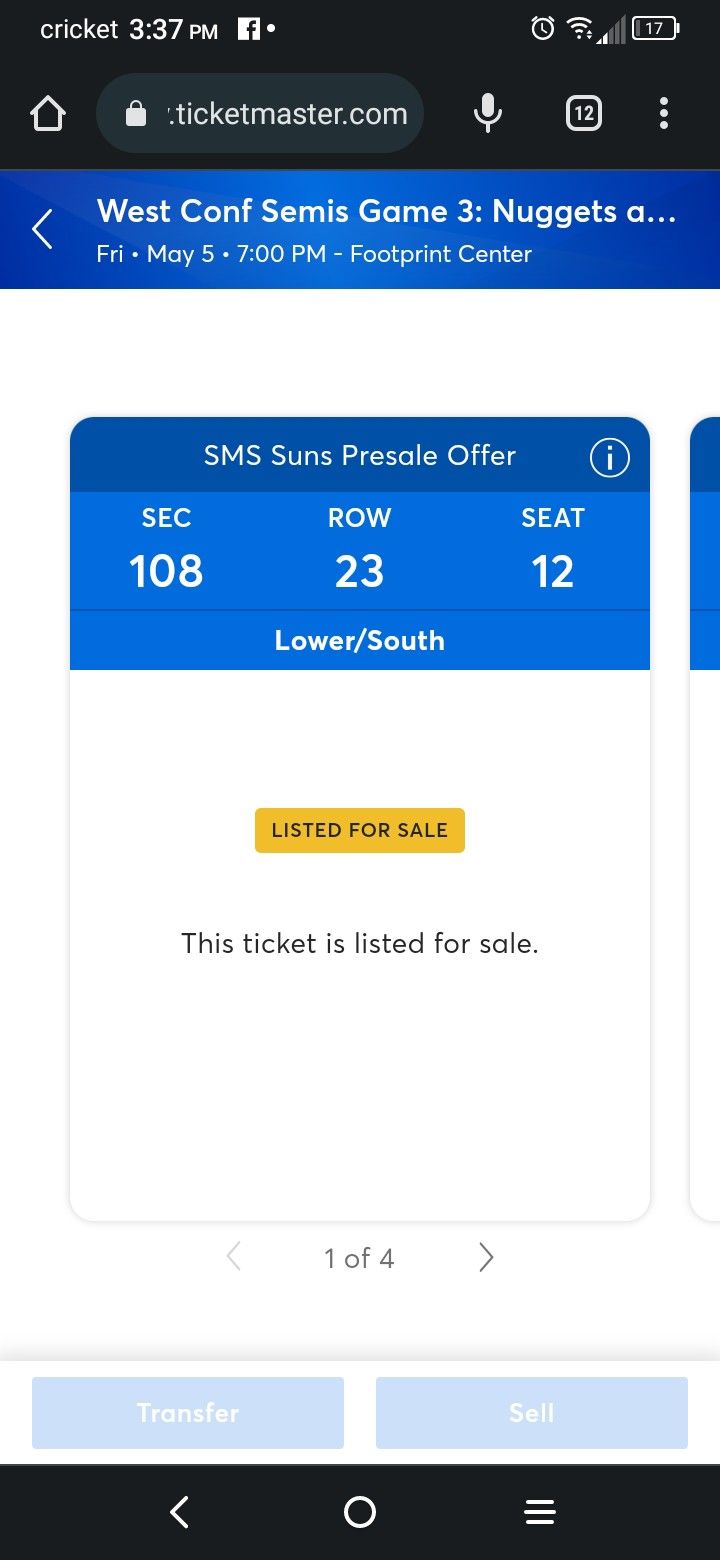 I have some amazing seats for game 3 of the playoffs Suns vs Denver's Nuggets right behind the basket section 108 row 23 seats 12 and 13 . I'm willing to possibly trade for silver/gold