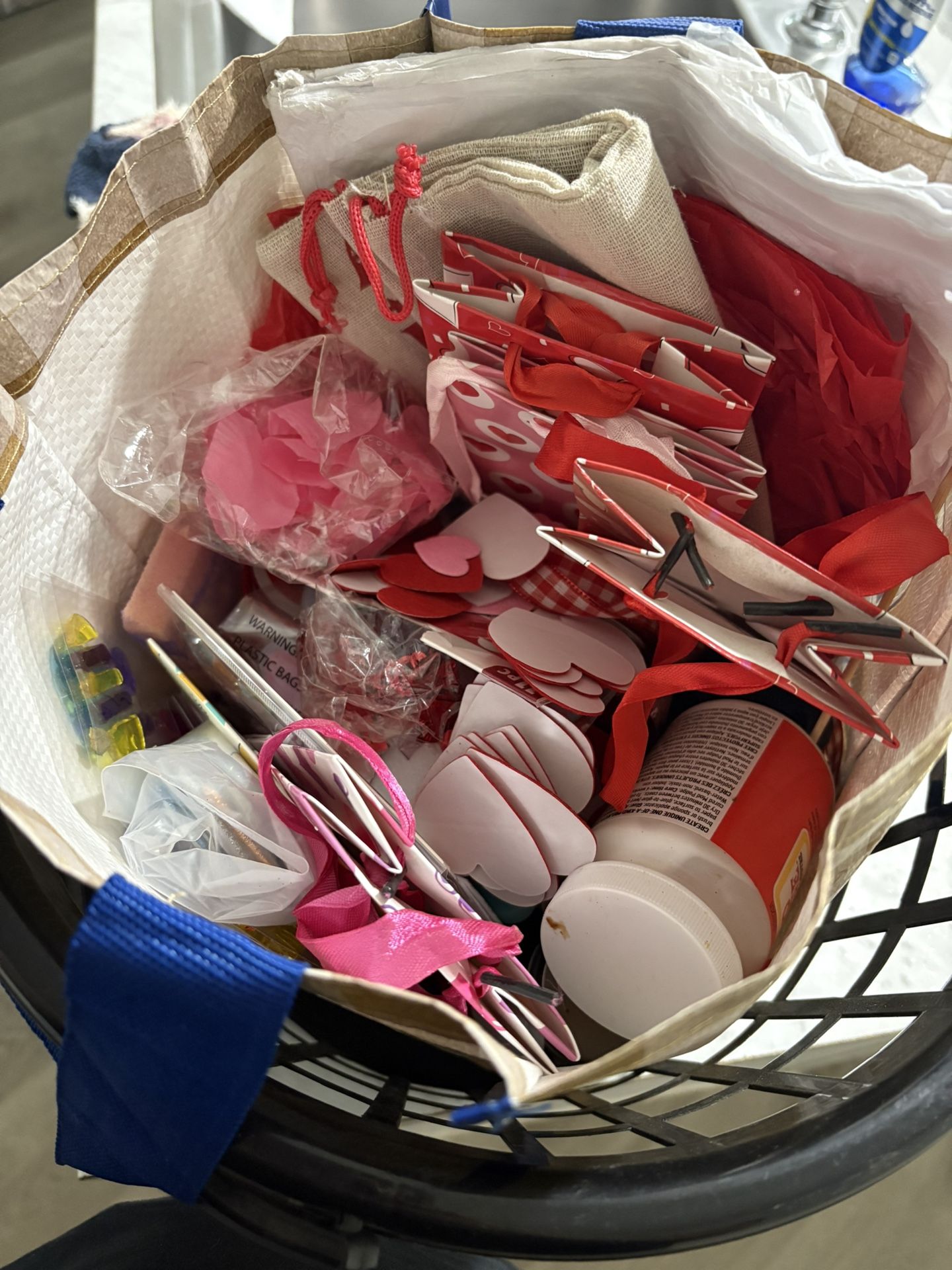 Valentine craft supplies Lots of glitter of different sizes, heart glitter things, stickers, flower petals mod podge, gift bags, stuffing paper, paints, paint brushes and sponges, a black plastic basket and two valentines signs All either brand new or barely used and in very good condition.