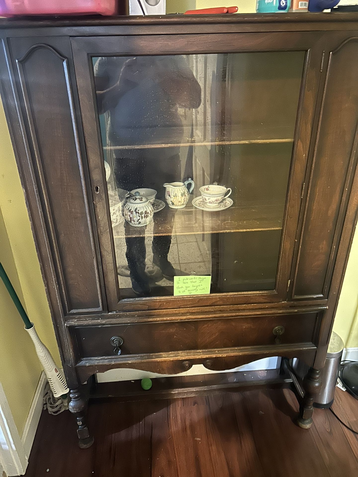 Vintage mid-century wood china cabinet with a classic silhouette and beautiful spindle legs. This is a one-piece unit, making it much easier to move and fit into smaller spaces than traditional bulky hutches. Solid and sturdy. Needs restoring. $225 or best offer