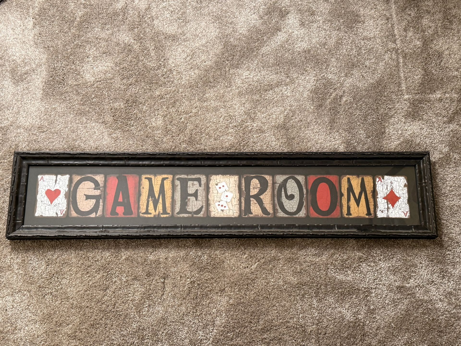 For sale I have this game room sign in pretty good condition. Frame is a little scratched however I believe it came from Hobby lobby like that brand new supposed to look like that asking $10 paid 47.99 for new.