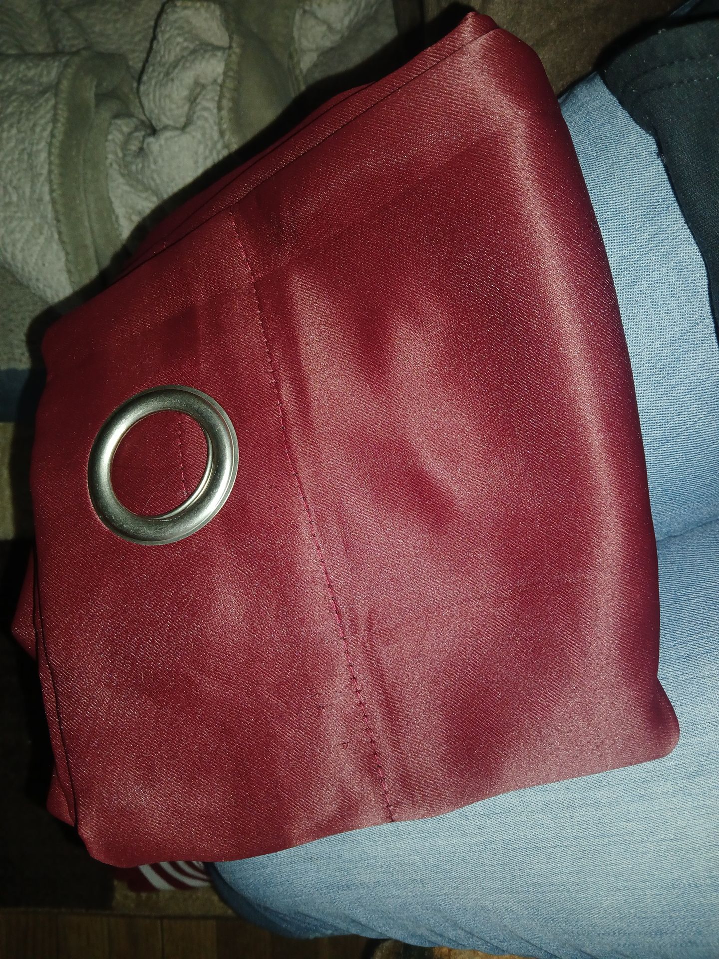 The "dusty rose" room darkening curtains are brand new and 38 x 45. There are two rod pocket panels. There's one "bugundy" grommet blackout panel, which is 40 x 63. Brand new. The white lace sheers are about 60 x 84. They are used. Not ripped or anything. Well taken care of. However they do have some cold air return stains. There are eight rod pocket panels. They are scalloped on the bottom. They would look pretty dyed blue. Smoke free, clean home. Cash only, please. I am asking $50 for everything, or the best offer.