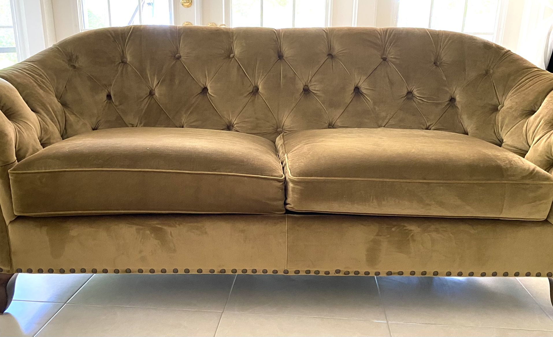Excellent, smoke free, pet free, Lauren by Ralph Lauren, velvet, tufted olive green sofas. 83” long, 27” floor to arm rest, 34” floor to top of back rest. Pick up only. West Boca.