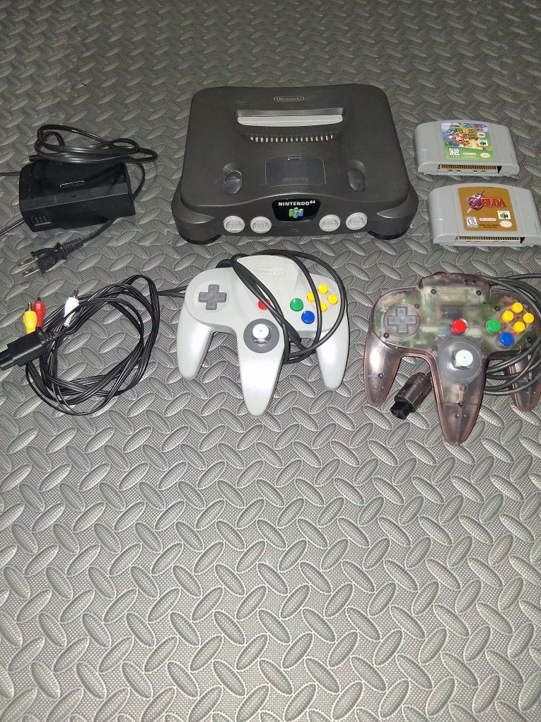 Nintendo 64 with 2 controllers, cables, Super Mario 64, and Zelda Ocarina of Time.
