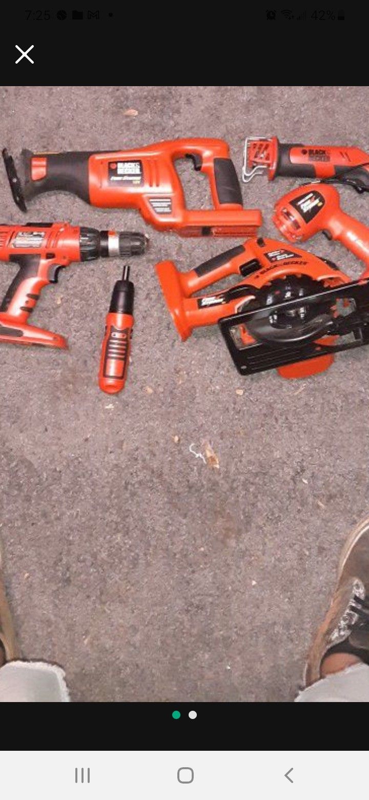 These are new condition. No battery no charger. You can upgrade to 20 v with a 12 dollar adapter on amazon Sawzall Skill saw Flashligh 2 screw drivers Jig saw Drill
