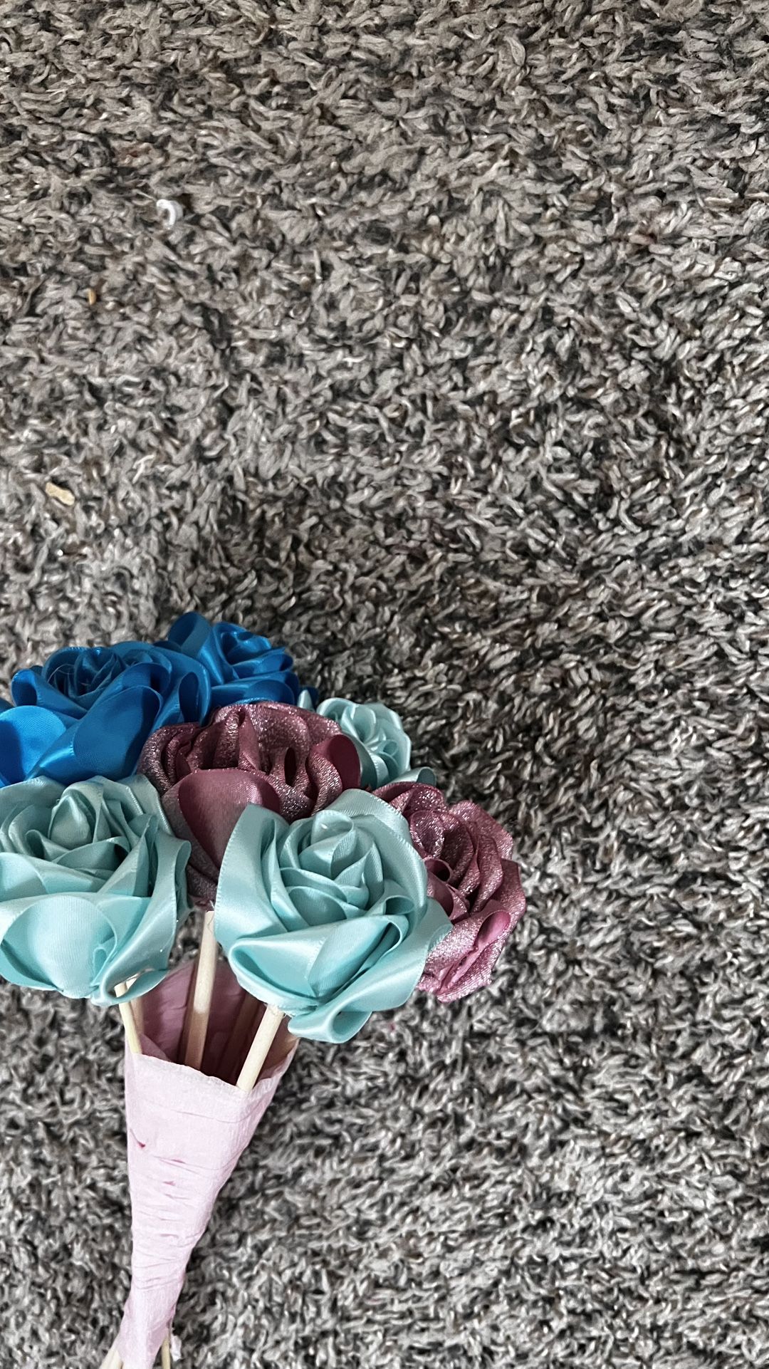 Beautiful handmade satin flower bouquet. Does not wilt, perfect for gifts, birthdays, weddings, or home decor. Condition: New Local pickup only. Price for quick sale.