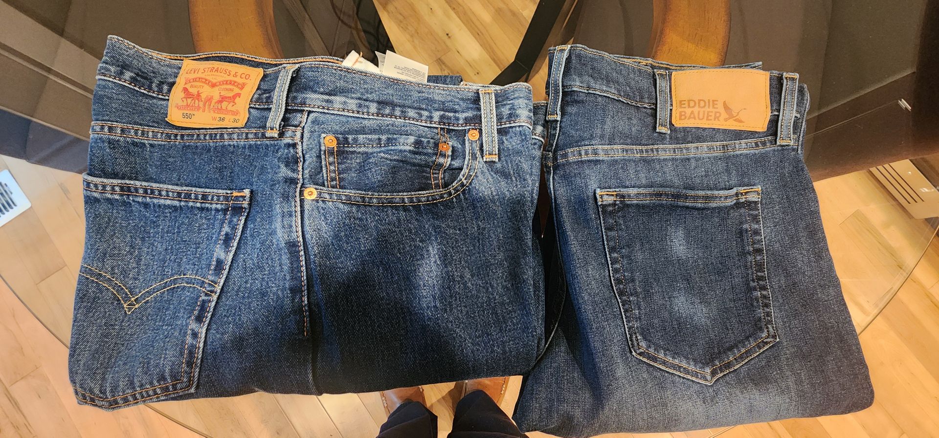 Both pair are 36x30, dark denim. Worn very few times, like new, no rips/stains, non-smoker Levis 550 $20 Eddie Bauer $20