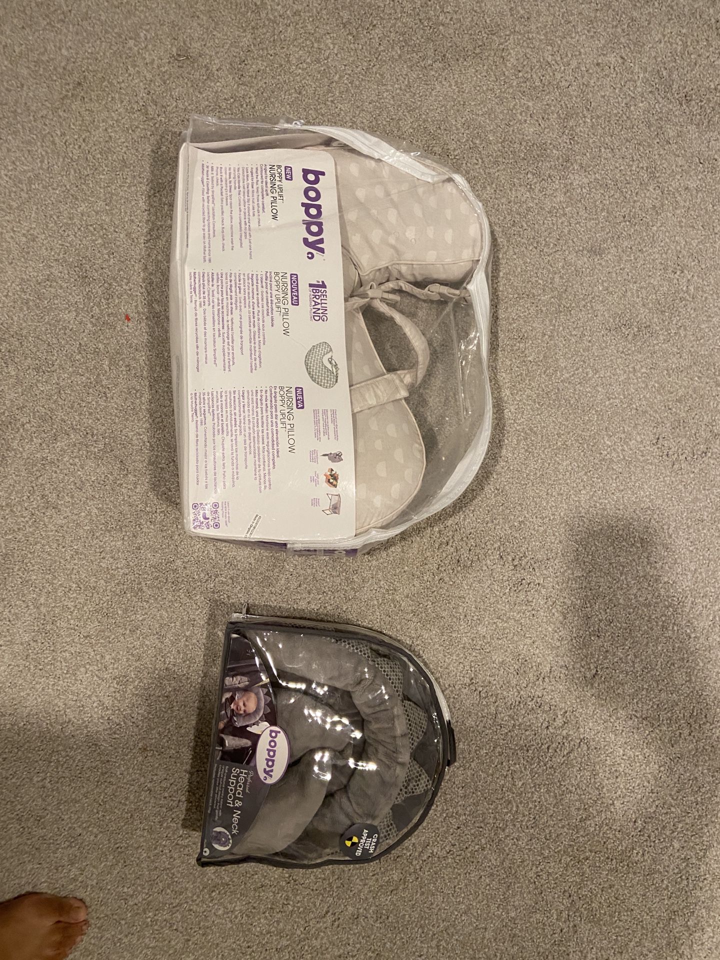 Brand New - received as gift and never used. Boppy head and neck pillow and Boppy Breastfeeding Pillow Retail $50+ for both
