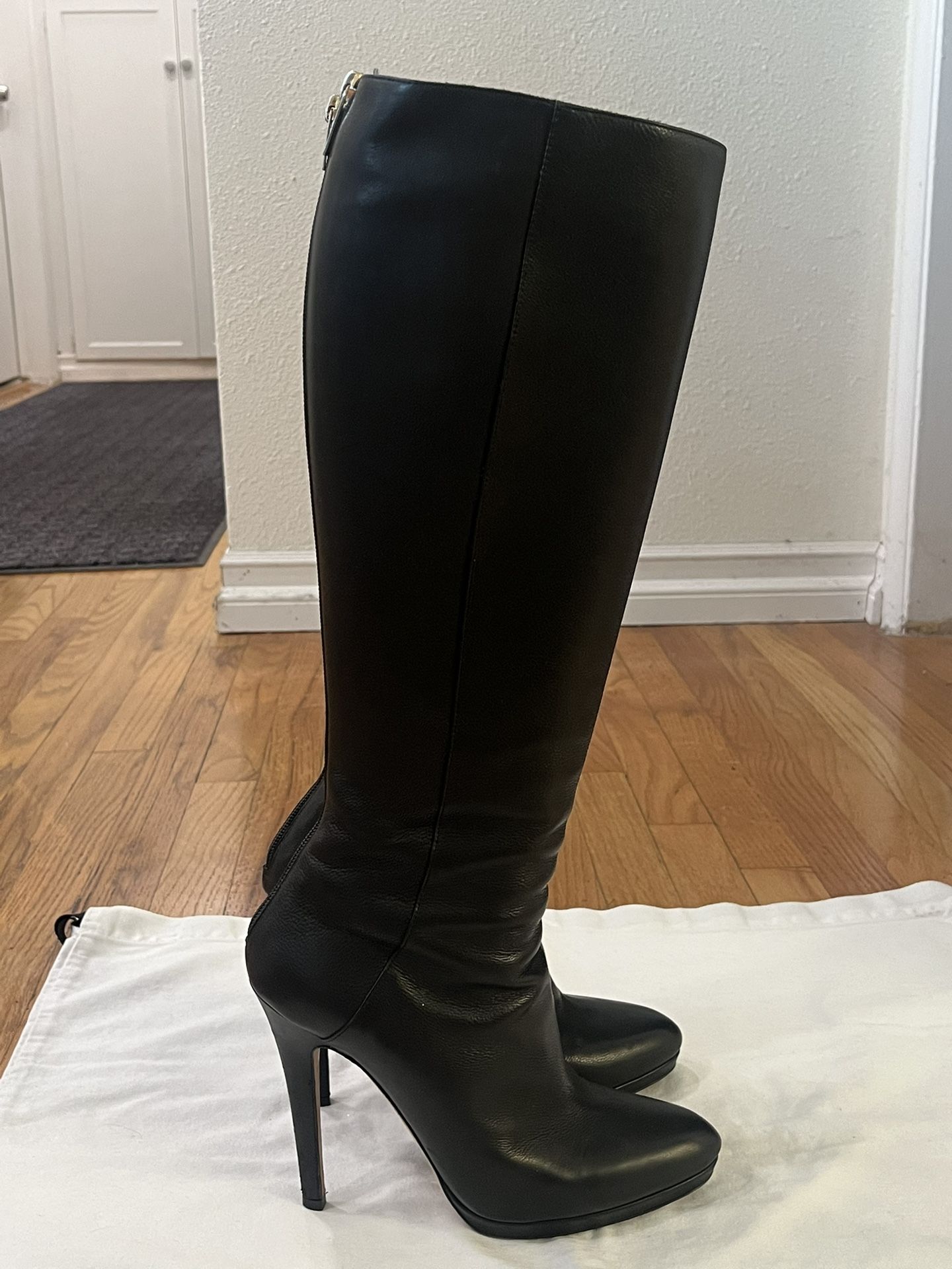 Jimmy Choo “GLYNN” Leather Platform Boots Color = BLACK Size= 38(7) A Wrapped Heel And Subtle Platform Elevate The Timeless Silhouette Of A Lightly Textured Knee-High Boot Back Zipper Closure Heel= 4.75” Platform = 1/2” Boot Shaft= 16” Calf Circumference = 13” Leather Upper And Lining/ Leather And Rubber Sole By Jimmy Choo; Made In Italy Please Note= This Boots Regular Worn, Still Good Condition, Clean Inside