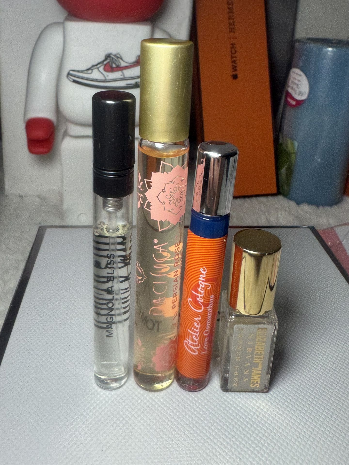 Bundle of 4 Travel sample fragrances (read) This bundle consists in. 1) juliiete has a gun magnolia bliss 5ml/0.17 oz 2) Pacifica persian rose perfume 10ml/0.34 oz. 3) Atelier Cologne Love smanthus 4ml/0.14 oz 4) Elizabeth James Nirvana french grey 3ml /0.10oz All them no box. You get in this bundle 22ml.