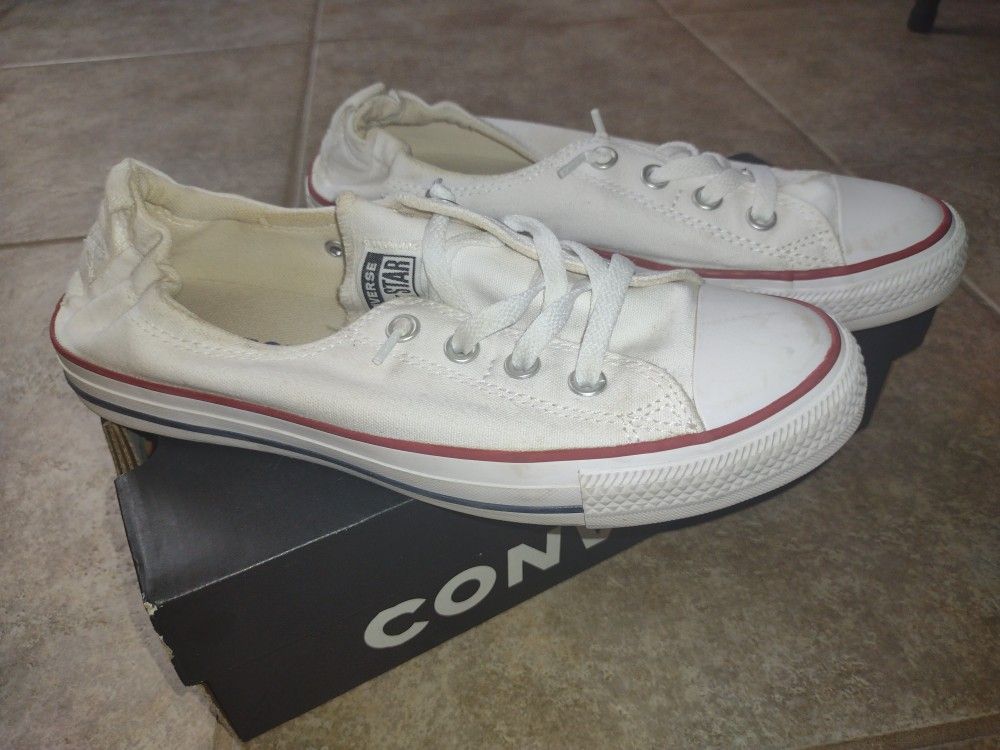 Converse Chuck Taylor Shoreline Slip White size 10 White Converse Chuck Taylor Shoreline Slip-on sneakers are women's size 10. Canvas upper has elastic collar for easy on and off. Low-top style with rubber toe cap and classic All Star branding on heel. Comes with original box. Yellow 981