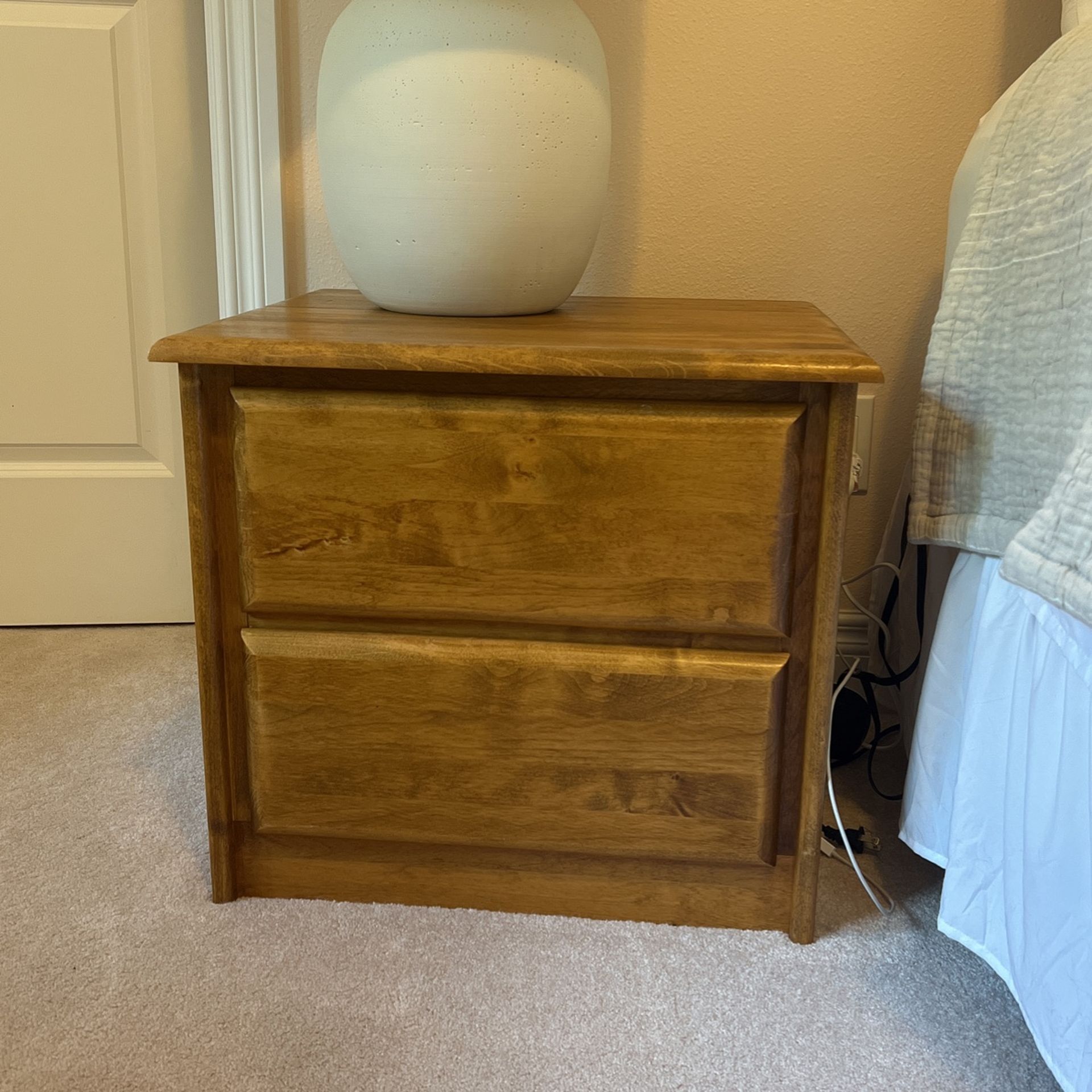 Honey, solid wood side table. Two drawers for storage. Great condition. No damage
