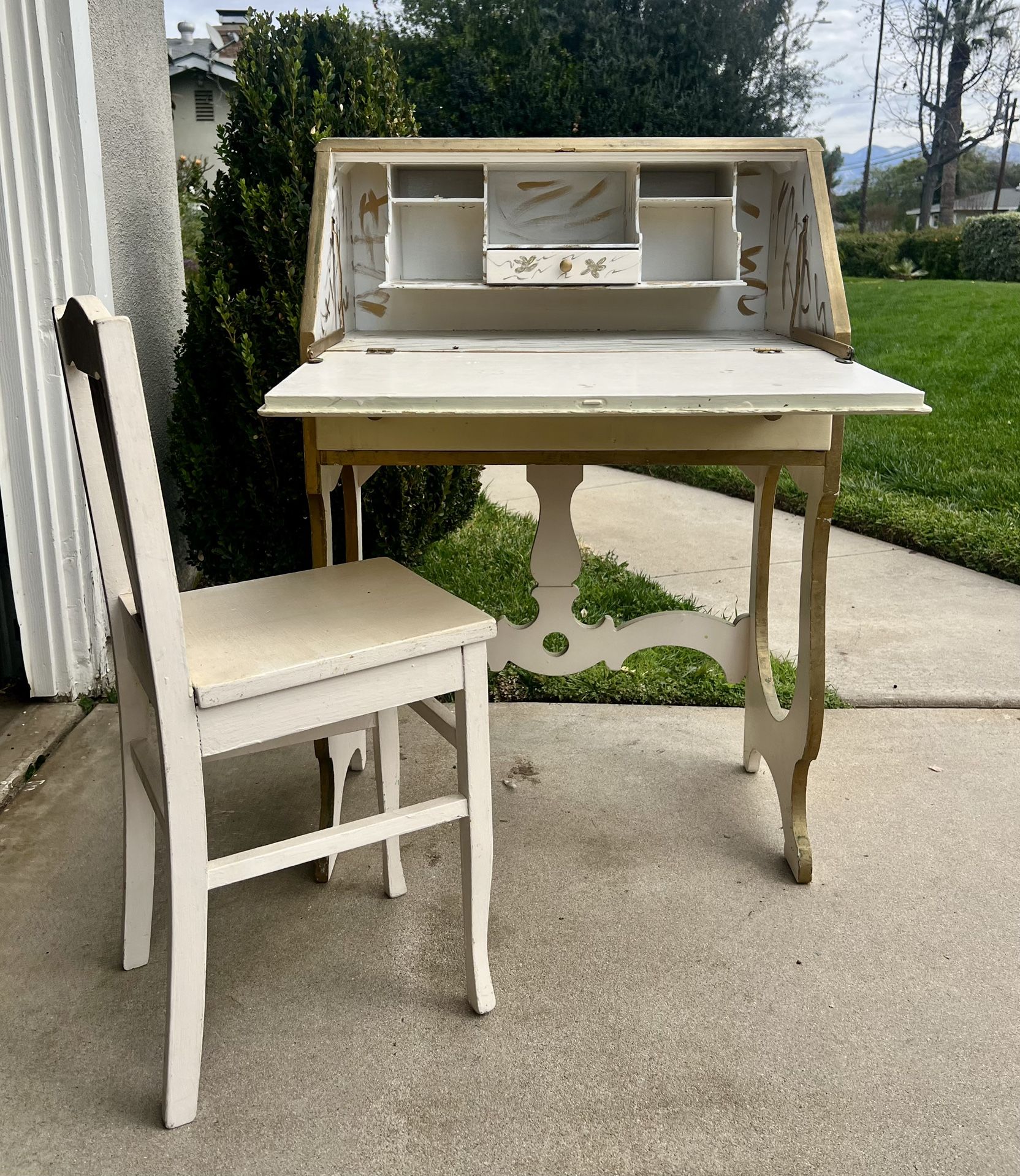 This piece is a vintage French Country hand-painted secretary desk, often associated with brands like Ethan Allen. It is characterized by its solid wood construction, off-white or cream-colored finish, and delicate hand-painted floral or scroll motifs. Key Features Design: A drop-front (slant-front) desktop that opens to reveal internal storage compartments. It has one large drawer. Style: French Provincial or Country French style, featuring curved cabriole legs. Utility: Designed for versatility, it can serve as a writing desk, storage unit, or even a decorative accent piece in various rooms. Similar Items & Market Value Similar vintage secretary desks are available through various antique and second-hand retailers: Vintage Ethan Allen Hand-Painted Desk: Often listed as part of a "Country French" collection. Chinoiserie Painted Secretary: More elaborate artisan-painted versions can reach higher price points, sometimes over $3,000. Standard Vintage Models: Refinished antique writing desks often range from $400 to $1,000 depending on condition and brand. Redlands, CA Cross posted I do not ship