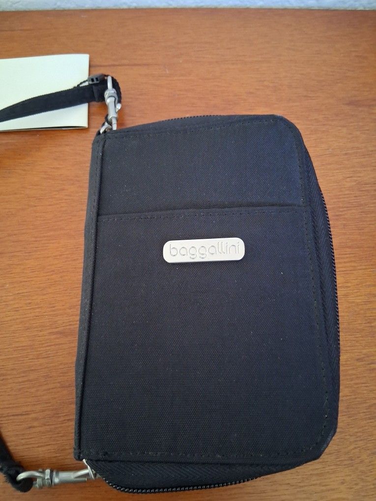 Black nylon water resistant wallet. Grat for travelling. Has back cell phone pocket . Inerior can hold money , cards and id pockets. Main zipper opens flat. 4"w x 5.75"h Brand new. OBO