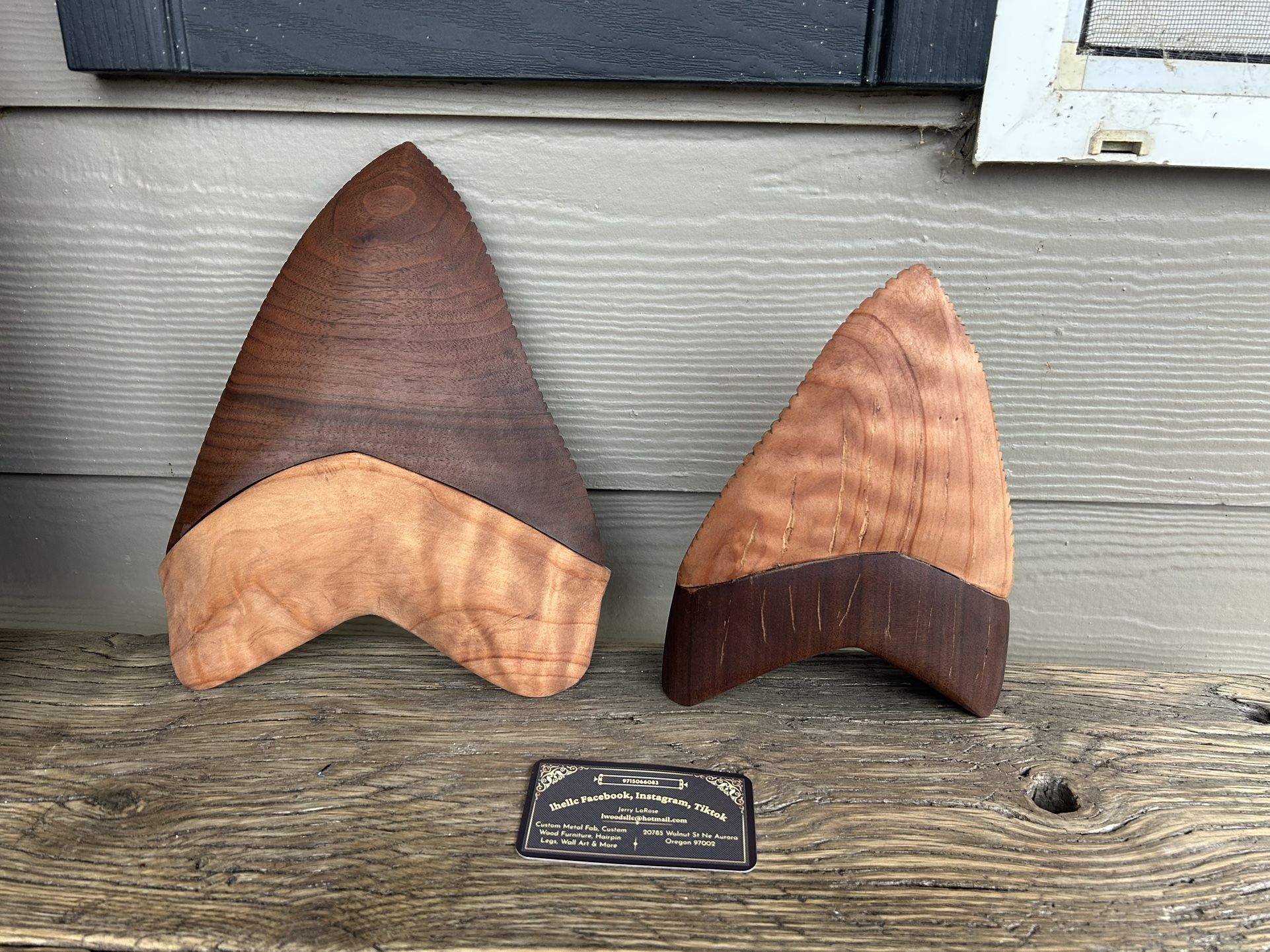 Lwoods Home Enhancements llc Bring the power of the ocean and the warmth of fine hardwood together in this handcrafted wooden shark’s tooth sculpture, expertly made from figured redwood and rich black walnut. Perfect Christmas gift Coastal & nautical décor Desk or shelf display Gifts for surfers, divers, and ocean lovers Rustic, modern, or natural interiors ManCave or Office Small tooth 8” tall X 6” wide x 2-1/4” deep $60 Large tooth 10” tall x 8” wide x 2” deep Base 8-1/2” long x 2-1/2” wide x3” tall 14” tall with wire stand $80 Cash or Venmo Will ship via pirateship for free Pick up in Aurora near the post office