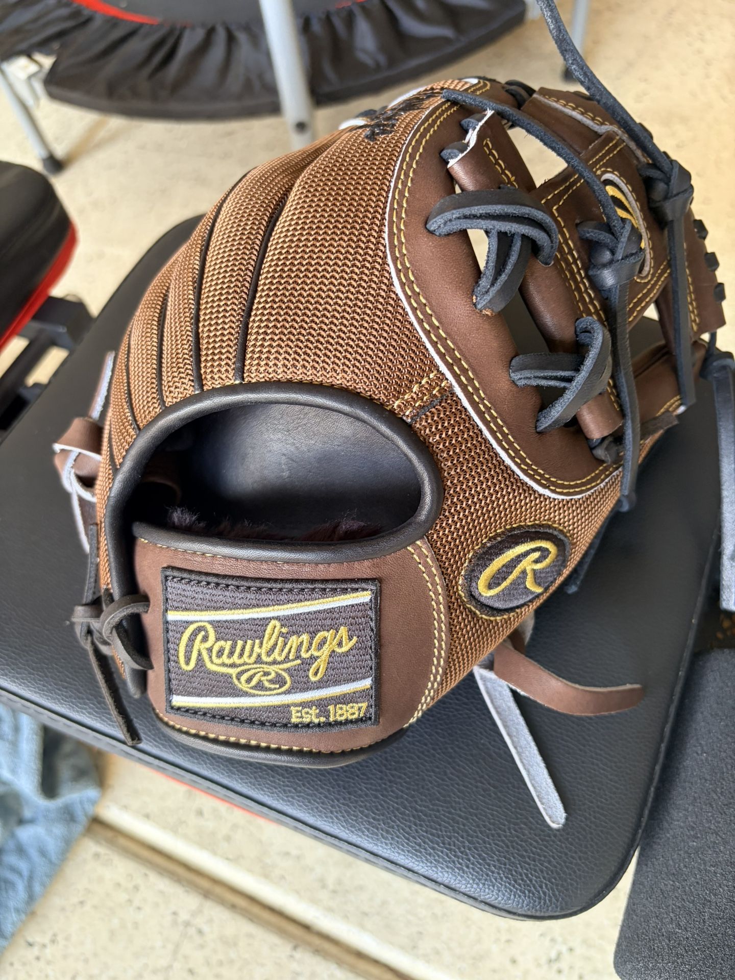 11-1/2 custom glove design with mesh back. Brand new never used, only tried on. Paid $400 and just received it a week ago. Serious buyers only.