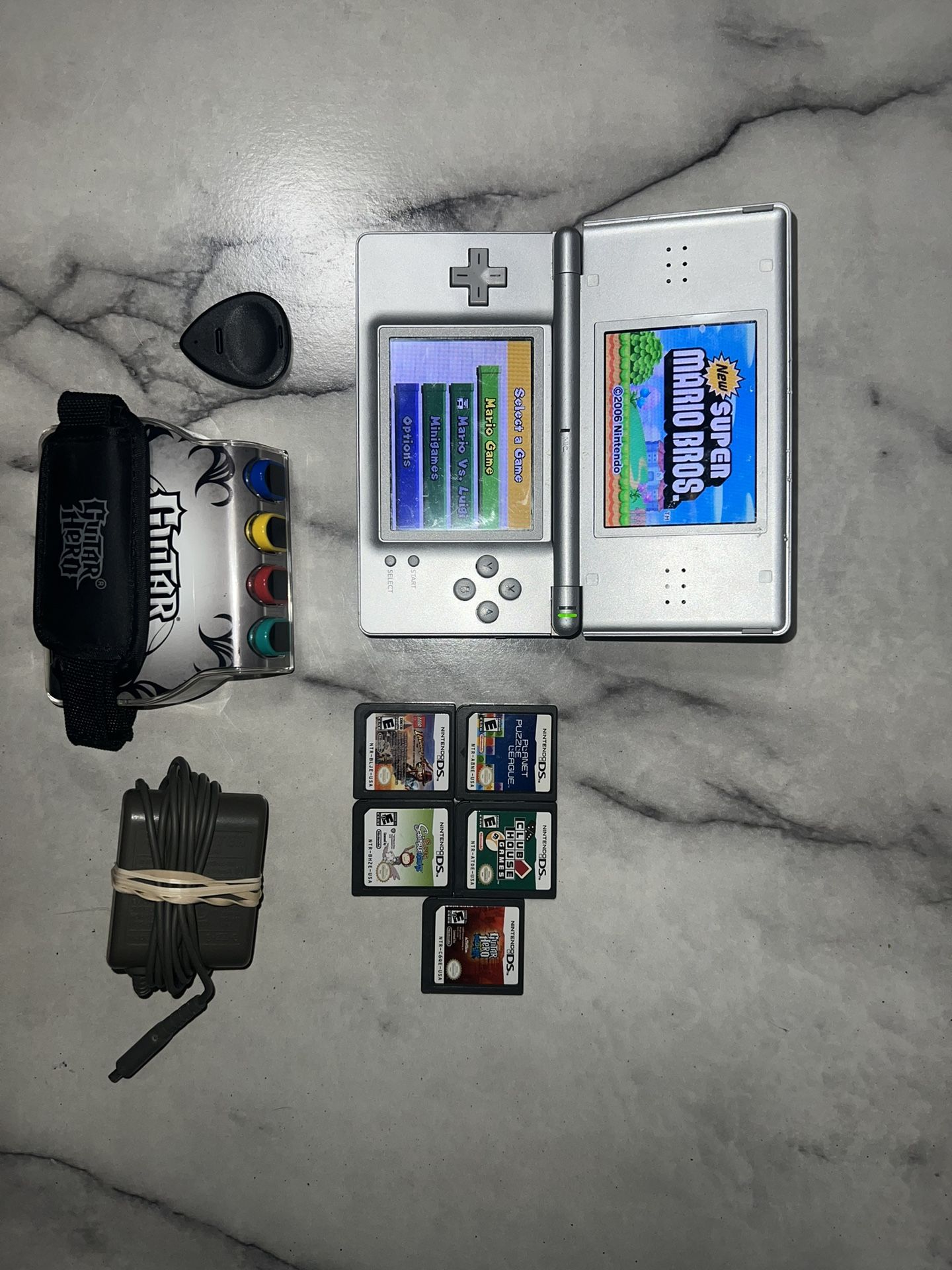 Retro Handheld in good condition. Played it during my childhood and now it’s time to past it on to a new owner that will be willing to enjoy it and take good care of it. Systems comes with the following: Guitar Hero World Tour Modern hits with complete Handgrip as seen in picture. $20 if sold individual Lego Indiana Jones 2 $14 if sold individual Club house games $17 if sold individual Planet Puzzle Leagues $25 if sold individual SuperScrible Nauts $16 if sold individual New Super Mario Bros $30 if sold individual System with stylus and charger $90 if sold individual (no gba cover cartridge) System is Pre-owned. Has a few scratches and minor dents. Does have screen protector on so the scratches on the screen is the actual protector itself. Not the screens. Everything is visible on the pictures provided. Every game works fine. Only Downfall is that the system will only read games when the cartage is installed while the system is off and then if it’s turned back on, the game will automatically start. Other than that, if cartage is inserted while the system is on, it won’t read for some reason. Easy fix with rubbing alcohol or air can duster. System Charges well, and buttons work. I know what I got and what it’s worth. Make me a reasonable offer and I will consider it. $ 170 if Bought together