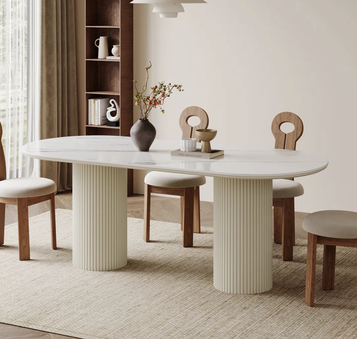 70.8" Stone Top Solid Wood Base Oval Modern Dining Table, Kitchen & Dining Room Tables, Rectangulardining Table For 6 Table only no chairs Brand: Wrought Studio Model: Stone Top Color: Beige Condition: New Open Box with blemish - see detailed pictures Dimensions in photographs SAVE HUGE ON THIS OPEN BOX ORDER CANCELLATION - small blemish on one of the base pillars as shown in the photographs. From the manufacturer- The perfect blend of classical and modern styles brings a unique charm to your home space. The countertop is made of high-quality stone after high-temperature firing from the rock plate, which is not only sturdy and durable, but also presents a different texture. The bottom is made of multi-layer solid wood painted in a dark brown tone that complements the rock slab, creating a relaxing family atmosphere. See Less Features • Multi-layer durable solid wood: The base is made of multi-layer solid wood, which is finely lacquered to give it a natural color that matches perfectly with the rock slab countertops. • Stable and secure: The simple leg design not only looks great, but also enhances stability and prevents shaking, providing a peaceful and comfortable dining experience. • Curved corners, safe and considerate: The tabletop is designed with curved corners, rounded and smooth, effectively preventing bumps and protecting your family's safety, and the details show the considerate design.