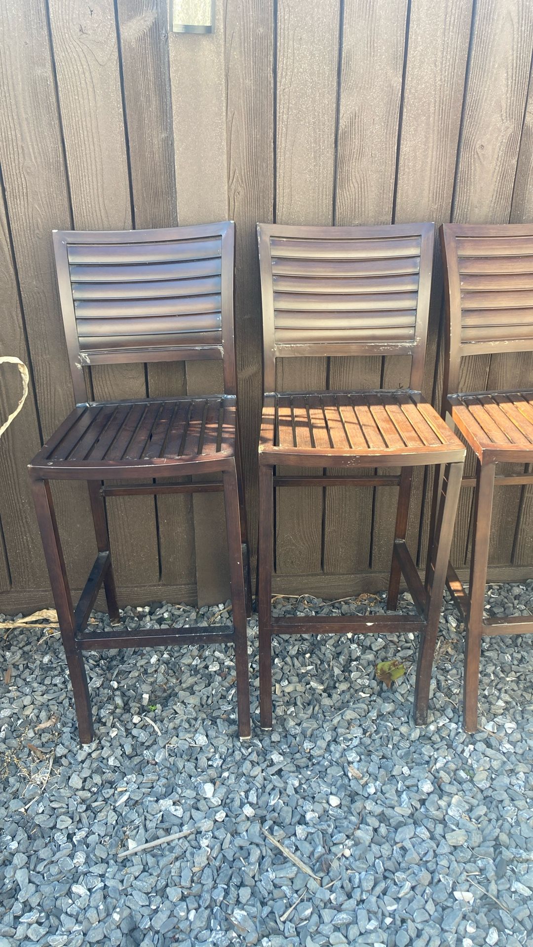 Dark brown, solid metal outdoor barstools. Seat height 30", total height 45", seat width 17". Total of 5 chairs available. $25 each or all 5 for $100. Minor surface wear and scratches but all are solid, no rust.