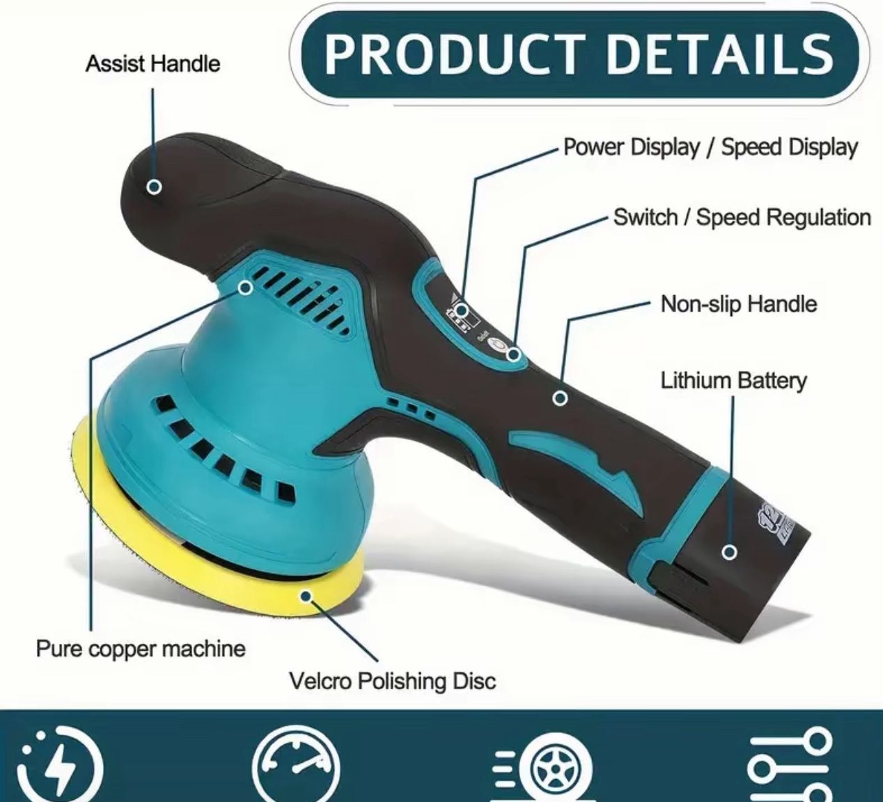 Cordless Car Buffer Polisher with 12V Lithium Rechargeable Battery*2, Cordless Polisher with 8 Variable Speeds, Cordless Buffer Polisher for Car Detai