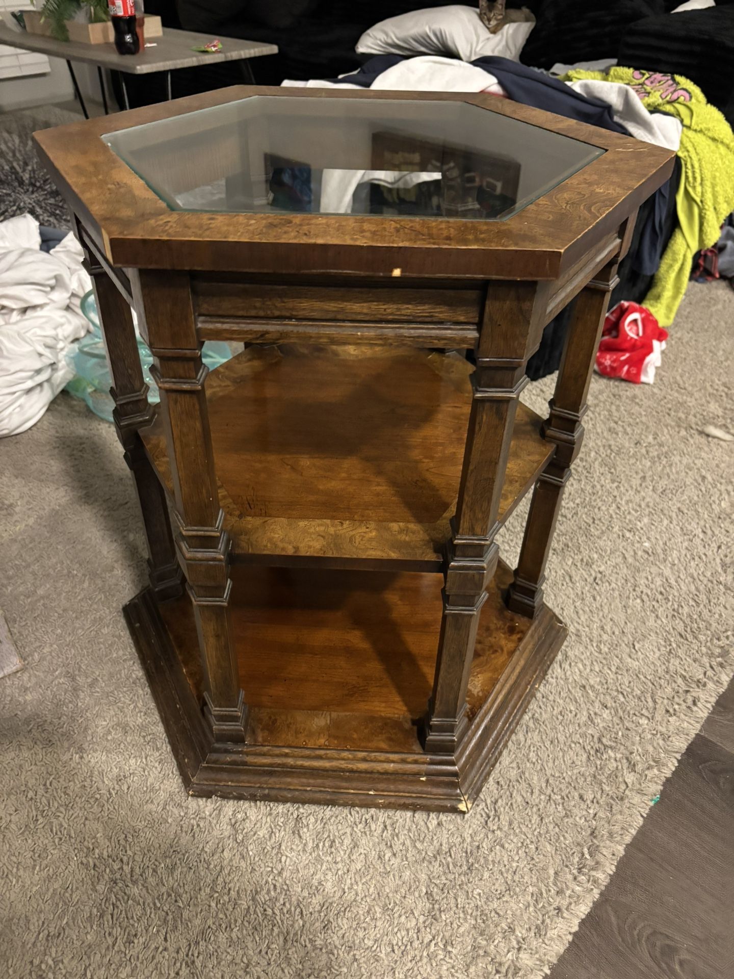 Solid wood hexagon accent table with glass top and two lower shelves. Very sturdy and heavy. Great as a side table, end table, or nightstand. Has some minor cosmetic wear from normal use (see photos) but nothing that affects function. Glass is intact.