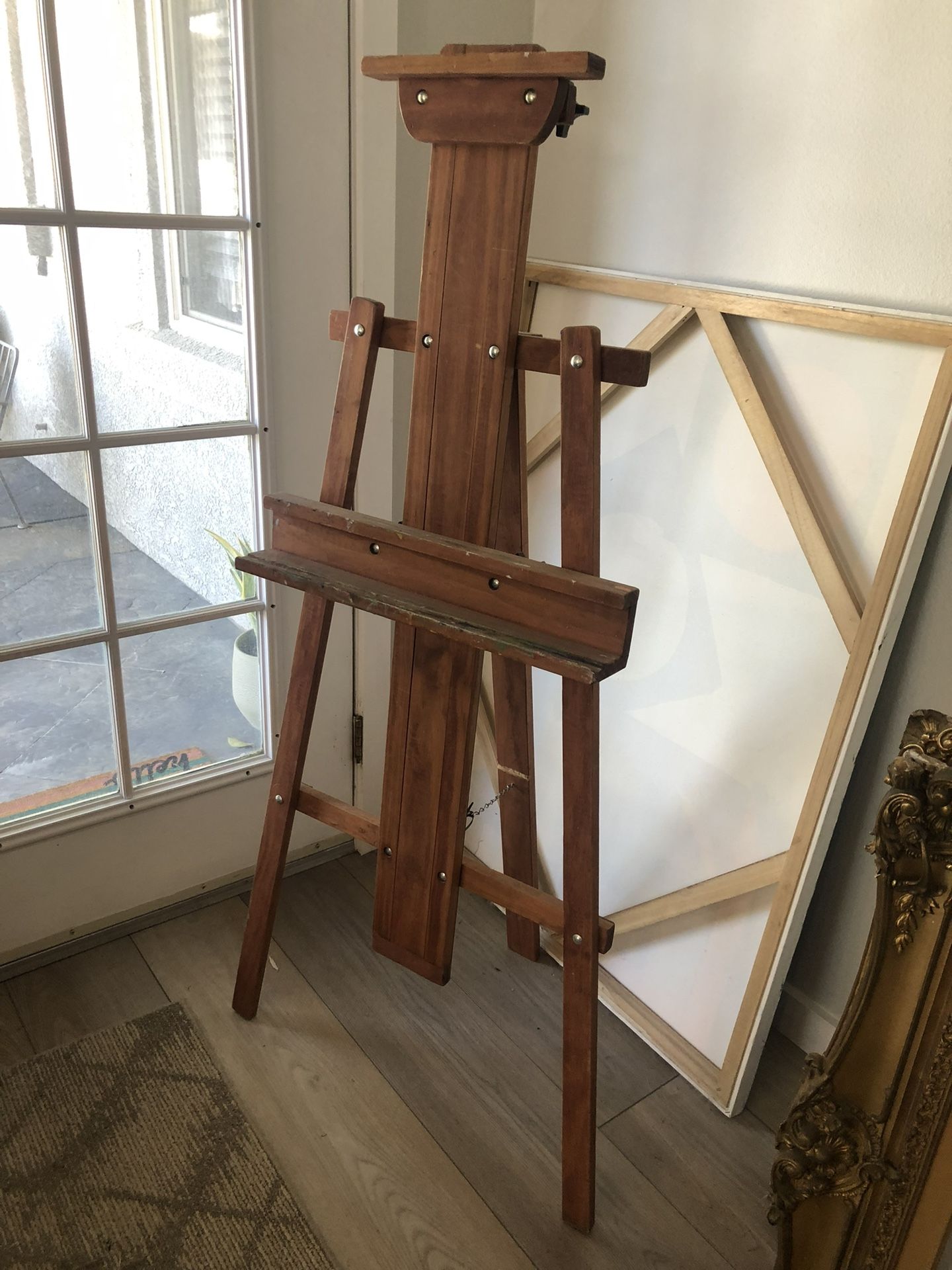 Wooden easel, great for event signs, or for painting. Back leg folds in so it can lay flat.
