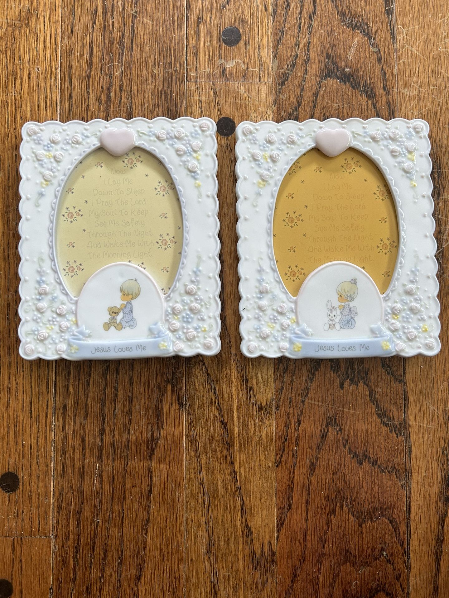 These are a pair of Precious Moments frames, boy and girl praying. They have a poem in them and it is faded so they can be used as a regular frame now. They have table top stands and are ceramic and have no chips or cracks. Have been stored in a curio cabinet and have not been handled. They are very sweet. They measure 5” w x 6” h and the opening is 3” W x 4” H. Come from a non smoking no pet home. Pickup only. No deliveries. No long term holds please. Cross posted.