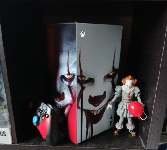 Comes with pennywise themed series x , 2 controllers, MLB the show 25 on disc, 2 rechargeable batteries packs, also has heat protectors on all vents. Adult owned comes in original box