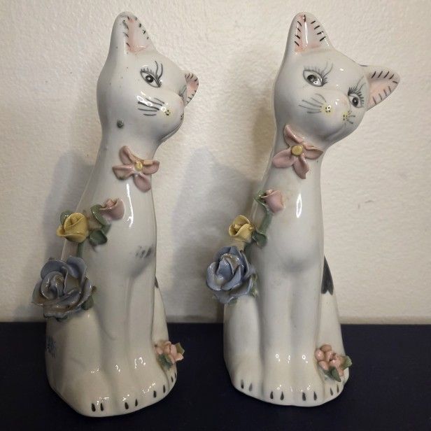 Pair of Vintage 9” Ceramic Porcelain Cat Figurine With Applied Flowers