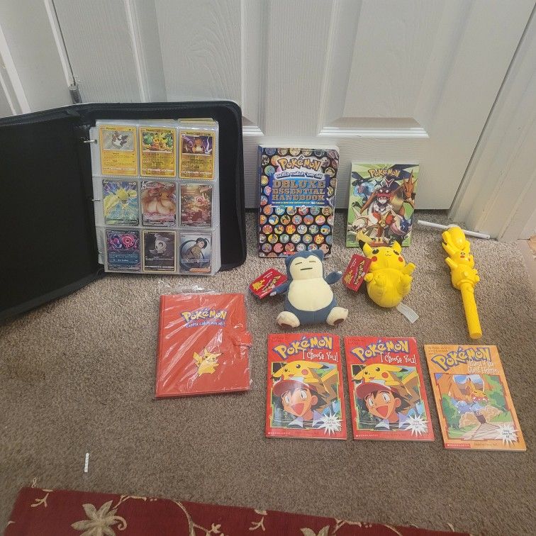 Pokemon Bundle Deal everything you see in the pictures you get a binder full of Holographics a pikachu fan 3 brand new books 2 used books a brand new binder in plastic im selling everything together not separately