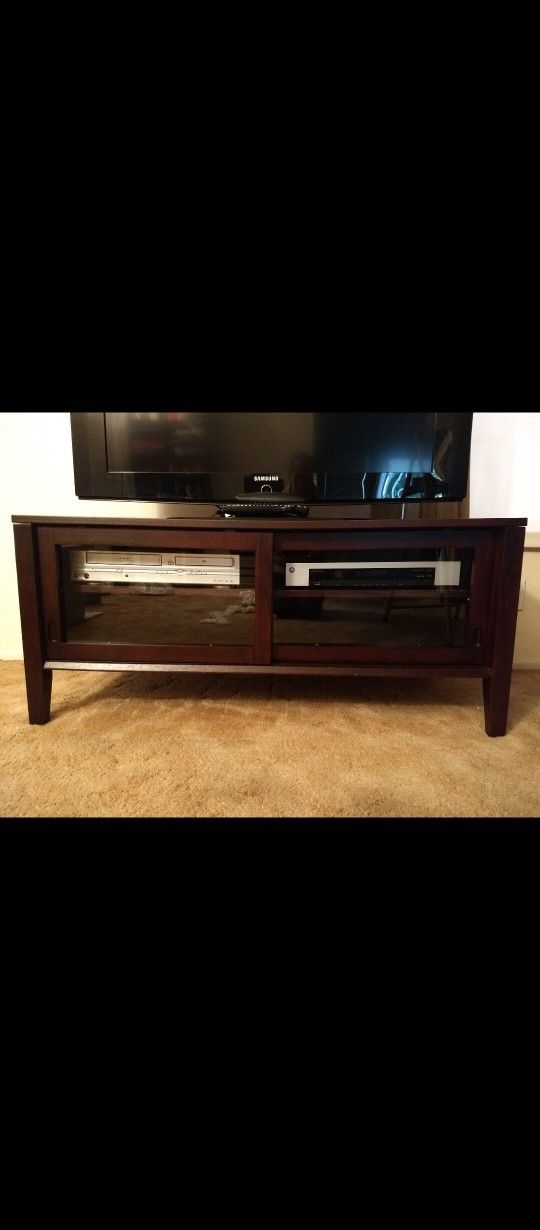TV / Television Stand / Console / Media Cabinet made by Target Home (Hudson Series) is made from real wood in a beautiful mahogany finish. -LIKE BRAND NEW (NO SCRATCHES OR DINGS) IN PERFECT CONDITION AS IT WAS IN A SPARE ROOM NEVER USED & ALWAYS WELL CARED FOR! -Features 2 moveable glass doors on smooth sliding rails (glides work well)for protecting TV accessories and elevating the stand's contemporary look while providing effortless access to stored items. -4 shelves for all your media and gaming device storage needs (DVDs, CDs, Gaming Consoles, and decor). -Also, features two cable cord management cut-out ports/openings to keep cords organized and hidden out of sight. -3 inch leg clearance allows for easy cleaning with a robot vacuum. -Accommodates 55 inch Television and supports upto 200 pounds. -FULLY ASSEMBLED AND READY FOR PICK-UP (save yourself the hassle of assembly). Dimensions: Width: 46.25 inch Depth: 20 inch Height: 20.75 inch Please note: TV and TV accessories NOT for sale/are for modeling purposes only.