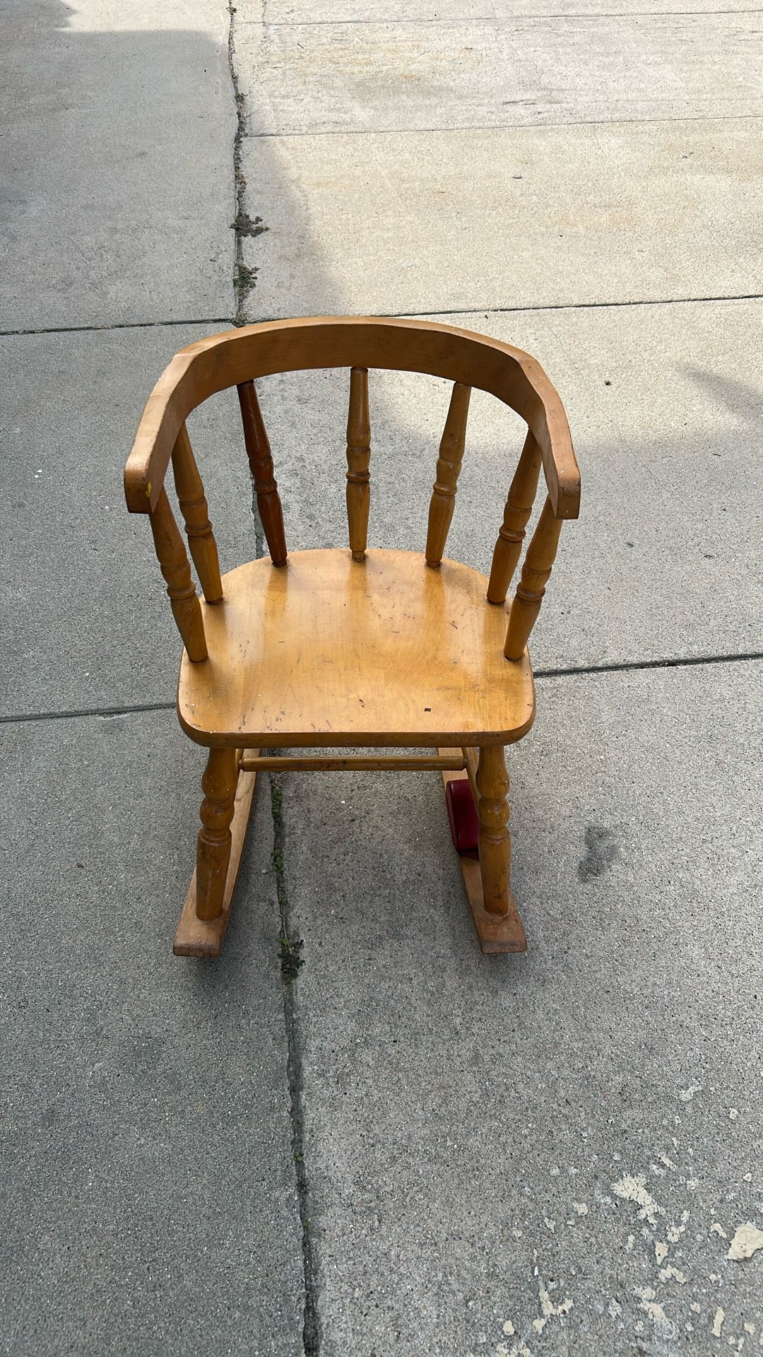 Wooden old fashioned rocking chair in gray condition. It has a box, like the ones on jewelry boxes that plays as the child rocks.