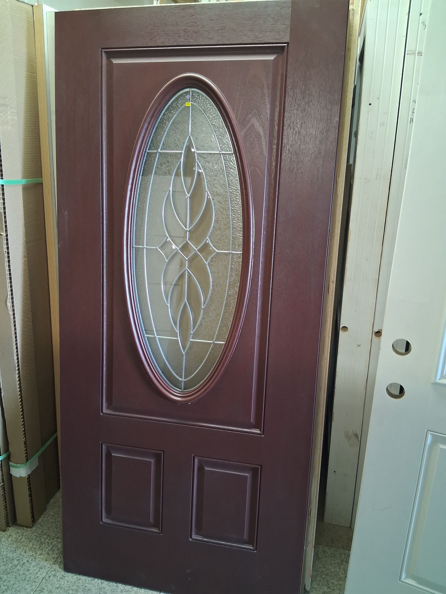 36" Front door Burgundy/red-brown Elegant Oval Glass design Can be made into any swing! ☎️For more info (contact info removed)📞 📣Feel free to visit our location 👇 📍B&R Molding & Doors 851 E Foothill Blvd Rialto 92376 Business Hours Monday-Friday 8:00-5:30pm Saturday 9:00-2:00pm