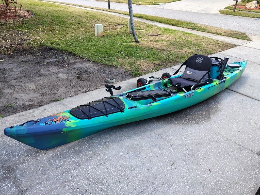 UP for sale, Jackson Kraken 15.5 Fishing Kayak for sale. In excellent condition. These are one of the fastest sit on top fishing Kayaks ever made. This Kayak looks great, and is designed for fishing and Touring. All the features were thoughtfully put together by avid fishermen to create one of the best fishing Kayaks ever made. The Kayak comes with, - Jackson 3.0 Elite seat - Jackson K-Crate cooler/Live bait tank "with rod holders - Kayak Dolley/Cart for transporting the kayaks - Paddle " BRAND NEW" - 3 different attachable rod holders - Waterproof bag that attaches to the back of the seat This is a great deal on a hard to find kayak. The weather is warming up and the fishing is getting good, so don't let this deal pass you by before the fishing season starts... Any questions, then send me a message.... Ignore: ocean kayak, paddle, peddle, trident, prowler, wilderness systems, tarpon, Cuda, Kilroy, mayfly, Hobie, outback, revolution, revo, pro angler, 12, 14, mirage drive, Werner, bending branches, fish.