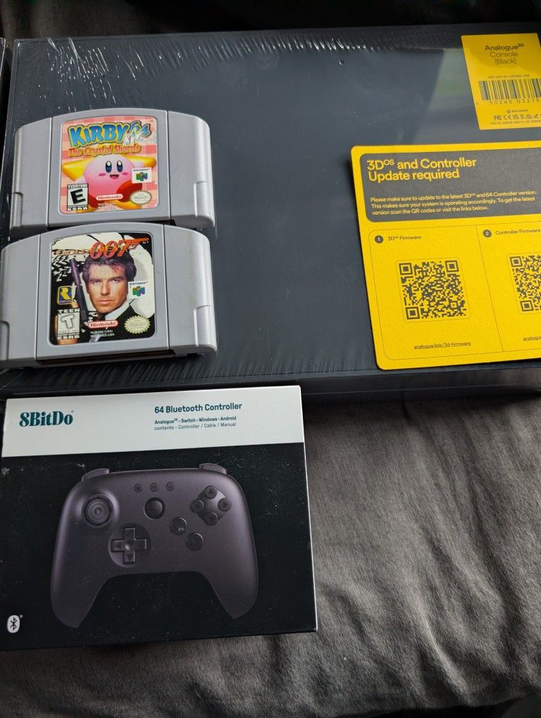Includes new, sealed Analogue 3D console, 8BitDo controller and 2 pre-owned games (GoldenEye and Kirby 64). System is in hand and available today so you can have it for Christmas. The console works with all N64 cartridges and accessories (except the expansion pack, but that's emulated on this console, so not needed). Price is firm. Must meet in Pompano.