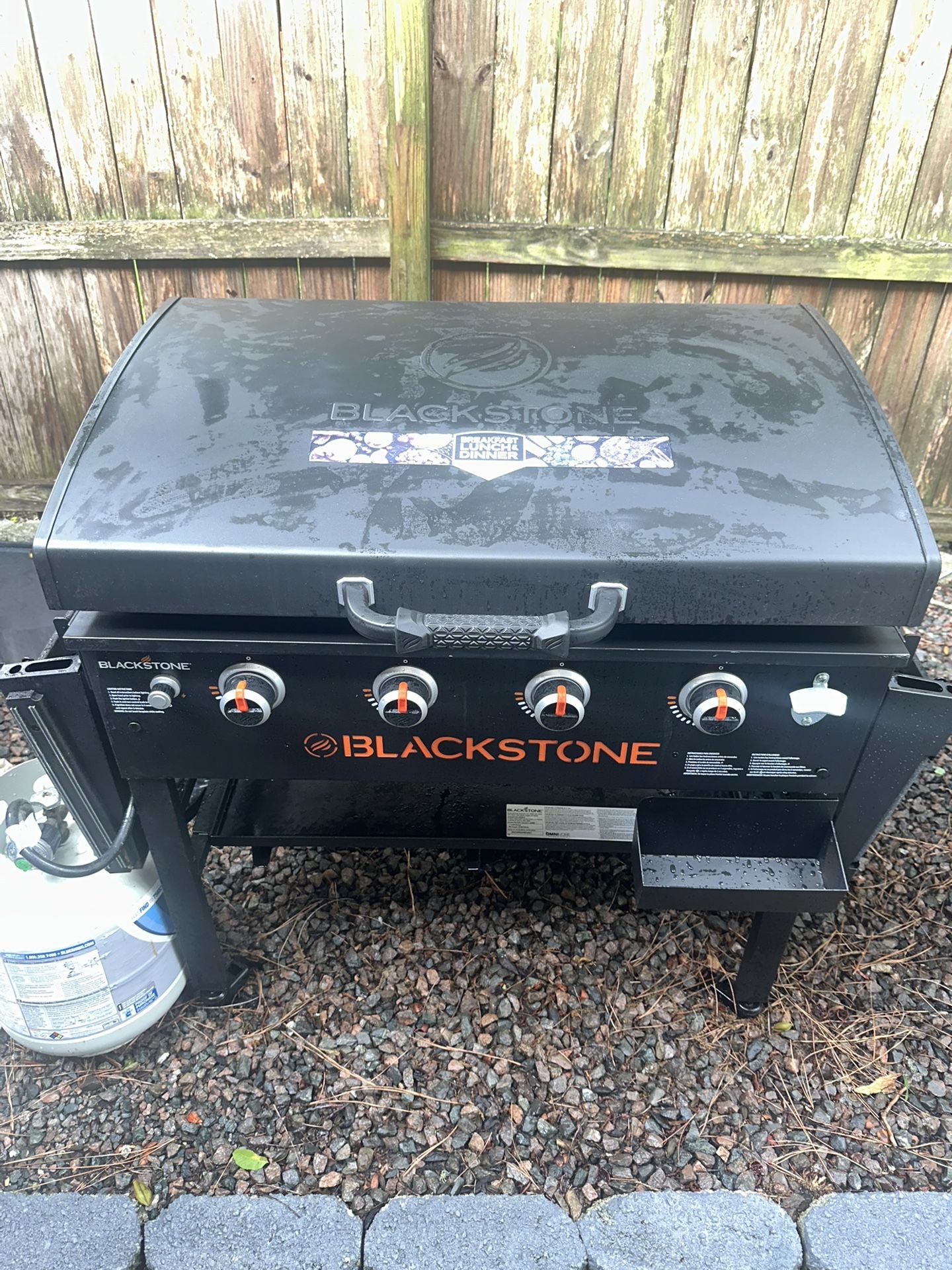 This is a good black stone 36” griddle works great for fast cooking. Only thing it needs is to burn off the rest of the grill plate .
