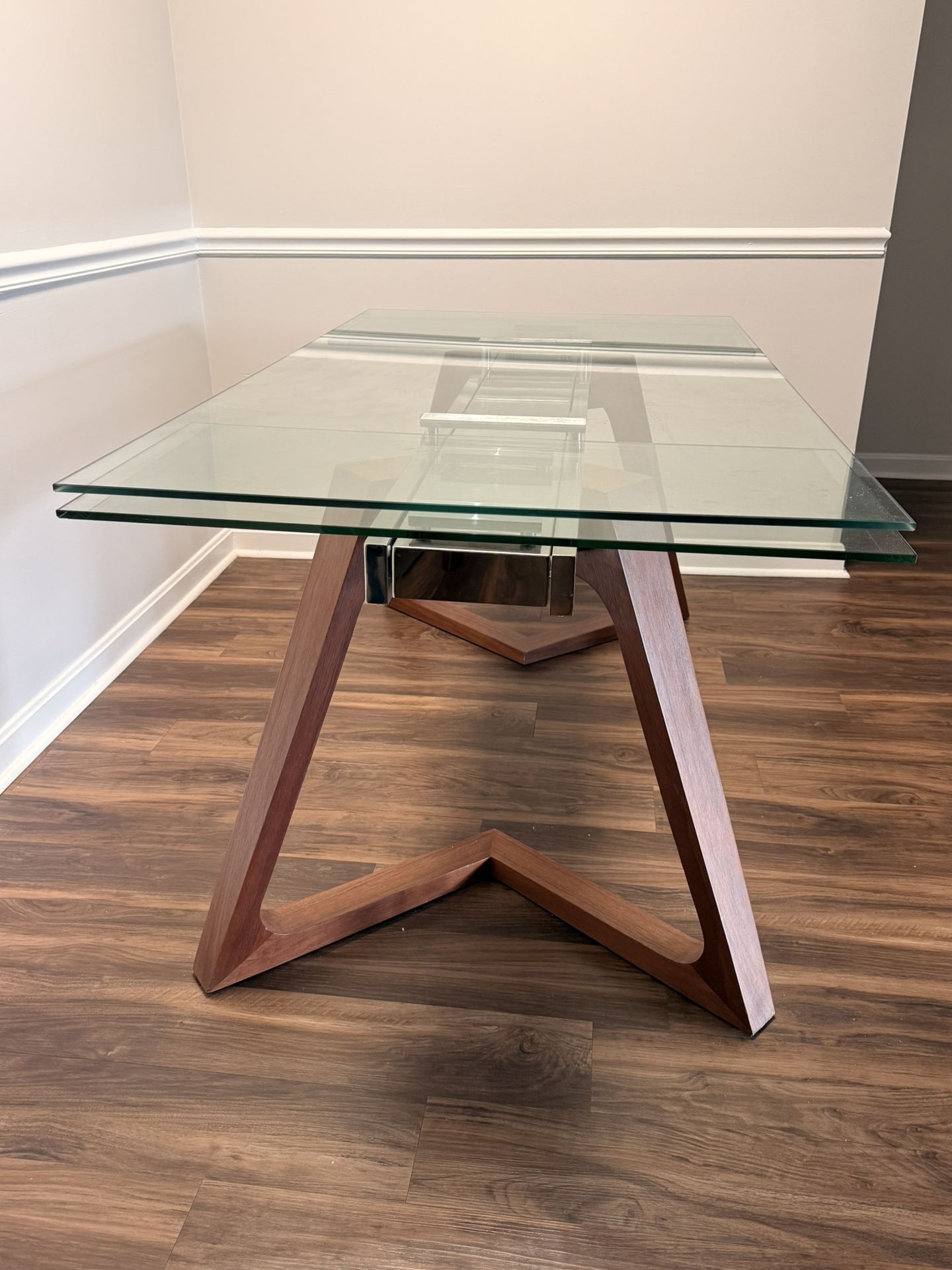Stylish desk with thick glass top and unique geometric wood base. Includes a frosted glass shelf for extra storage. Approx. 60–65” W x 27–30” D x 30” H. Clean, sturdy, and perfect for home or office. Message me if interested!