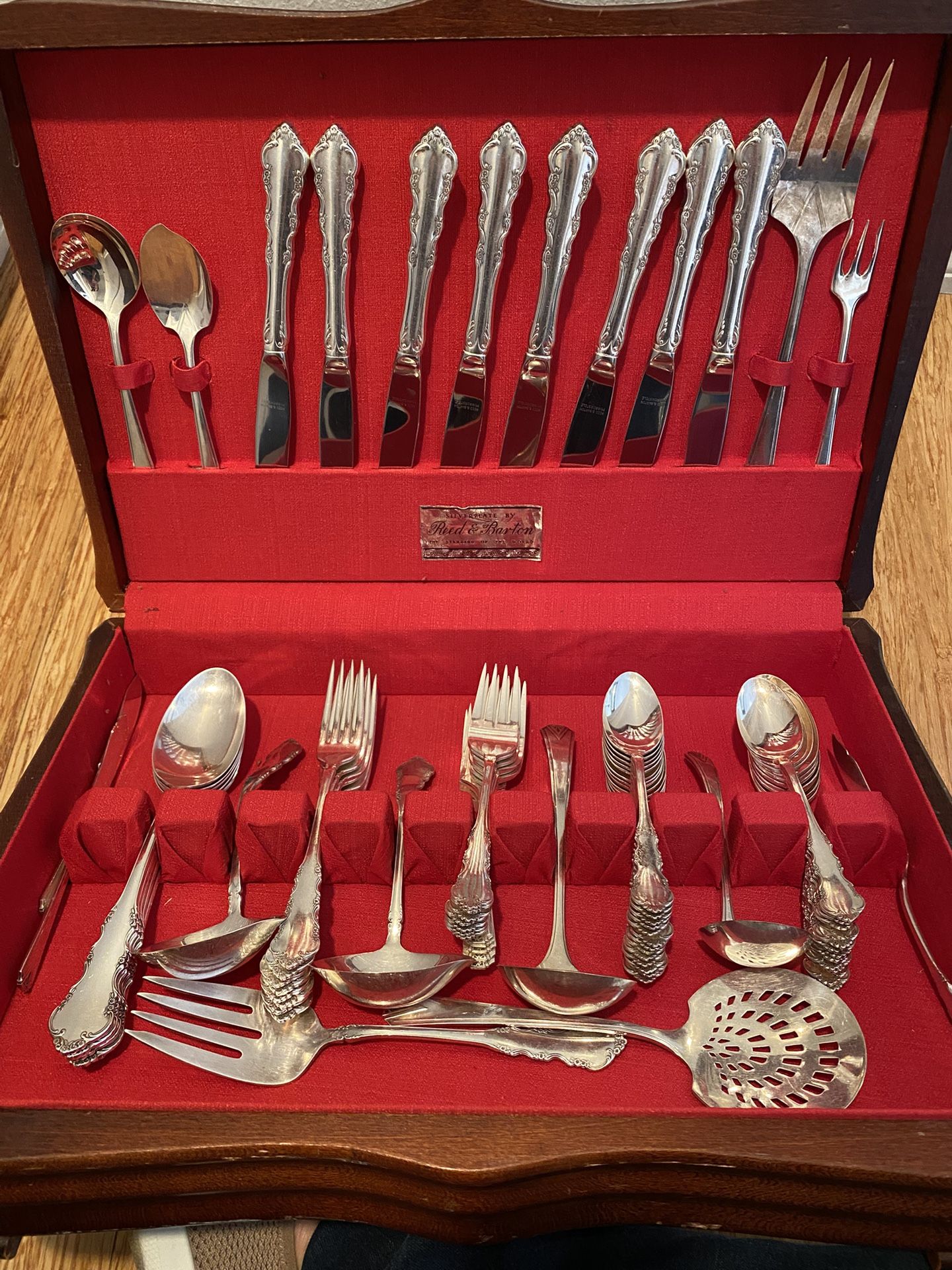 Includes: • 8 dinner knives (marked “Mirrostele” stainless blades) • 8 dinner forks • 8 salad forks • 8 teaspoons • 8 soup spoons • 8 butter spreaders or cocktail forks (if included) • 6+ assorted serving pieces (ladles, serving forks/spoons, slotted spoon, etc.) Housed in the original Reed & Barton wood chest with red felt interior. Condition: Gently used, bright and shiny, minimal surface wear consistent with age.