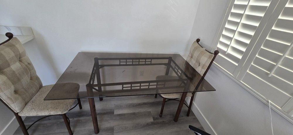 Modern glass dining table with 2 chairs. Perfect size for: apartment small dining area kitchen Glass top table with sturdy wood base and comfortable chairs. Good condition.