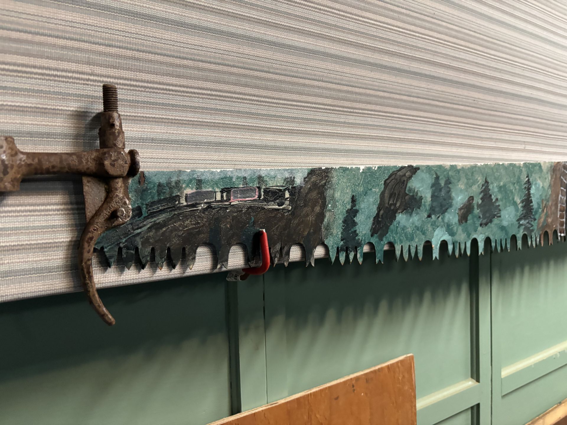 Approximately 7 ft long painted one man saw.