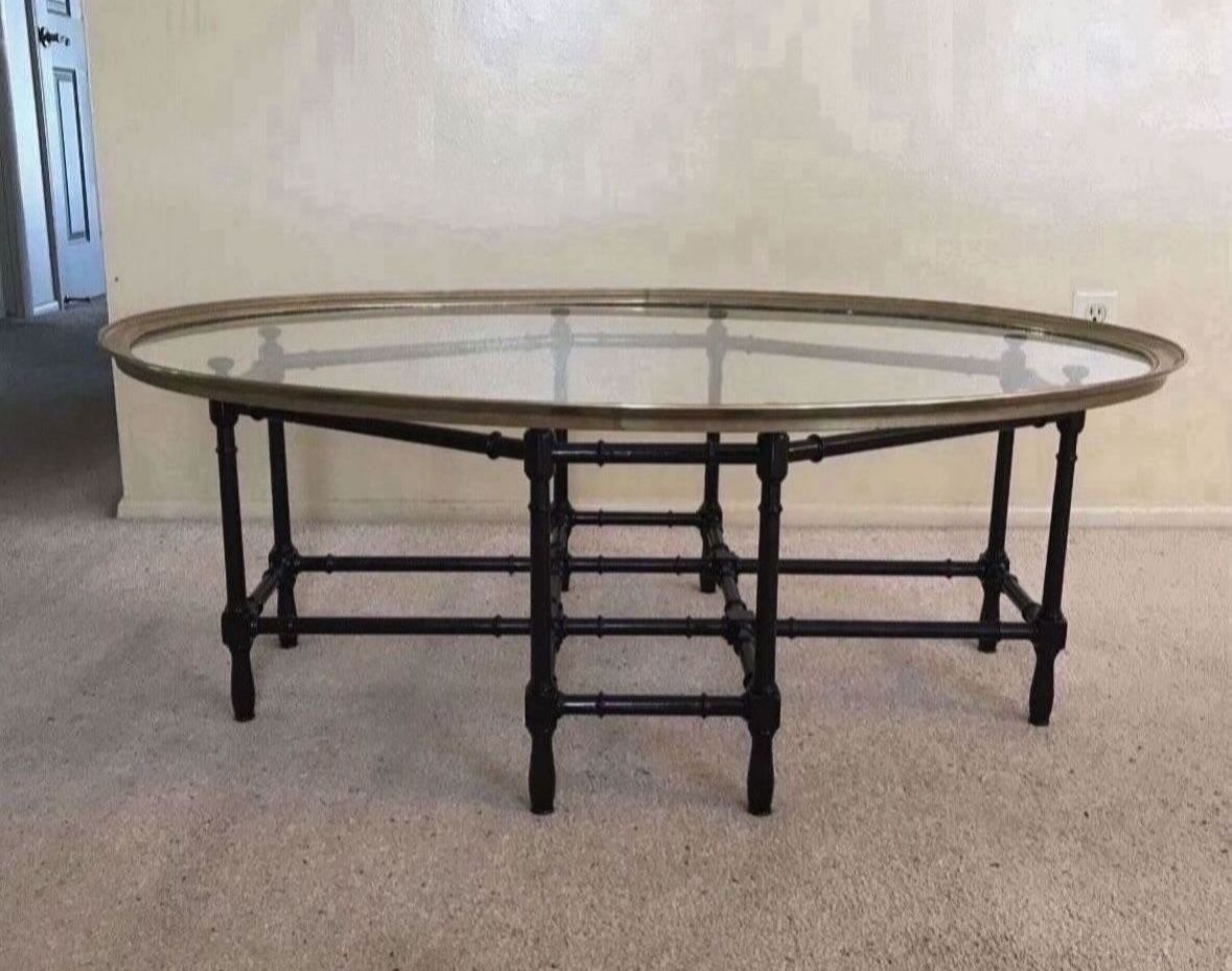 If you see this ad then item is available, messages just asking if item is available will be ignored. Beautiful vintage antique large Mid Century Baker Mastercraft Furniture oval cocktail or coffee table. It has the iconic faux bamboo black base and glass top with brass edge. Table measures 44” by 30” and is 16” tall. Glass sits on the base and could be removed for transporting. Goes beautiful with Hollywood Regency decor and you can mix it with Traditional or Classic and contemporary decor as well. Similar table sells online for around $2400 excluding shipping and tax. pick up in Tempe
