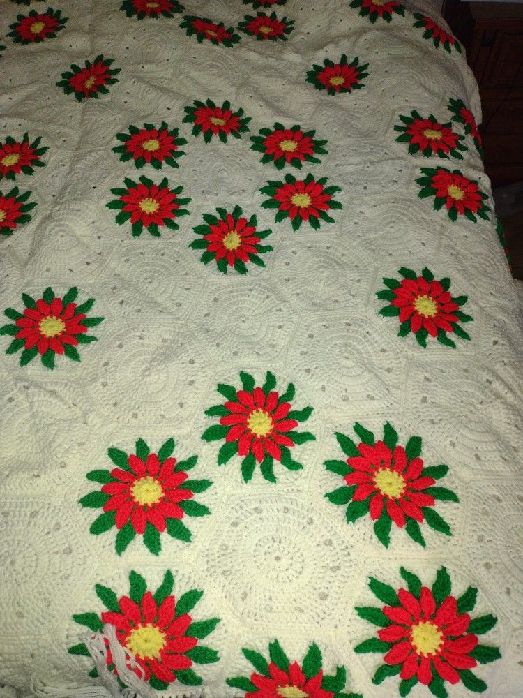 Professionally hand made. Beautiful snow white with bright Poinsettias. New. Only spread out for photos. Size is 86" X 65". Hours of work done here