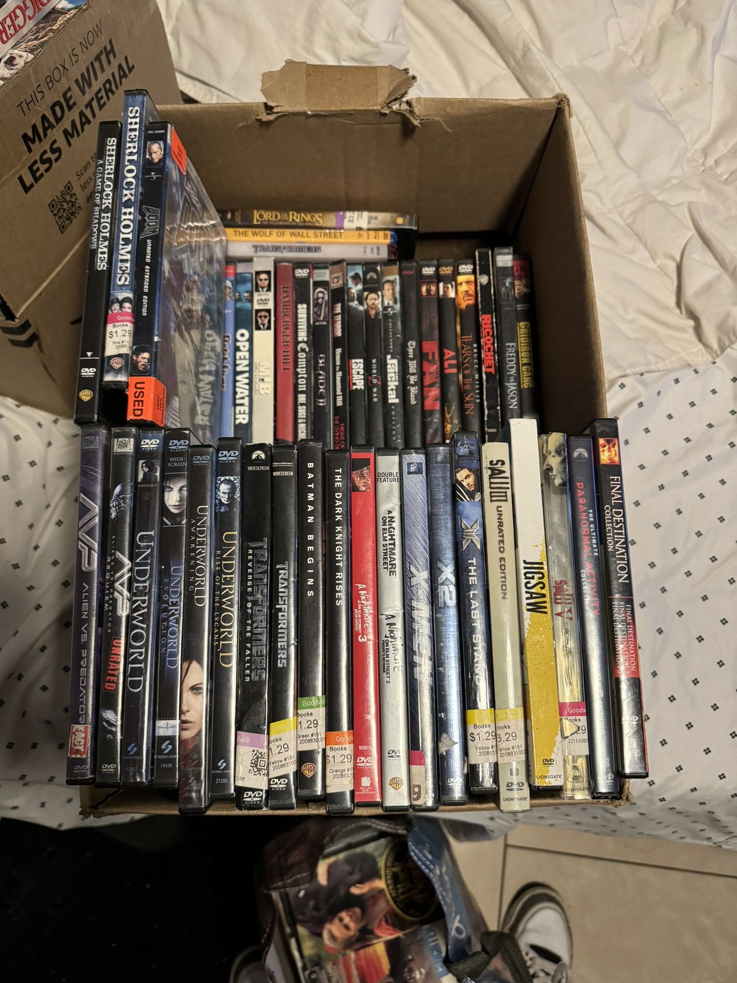 5 $ each movie or 300 $ for all took 25$ off if you buy all. Some movies are more $ in stores selling as is only pick up. There’s around 40 dvds.