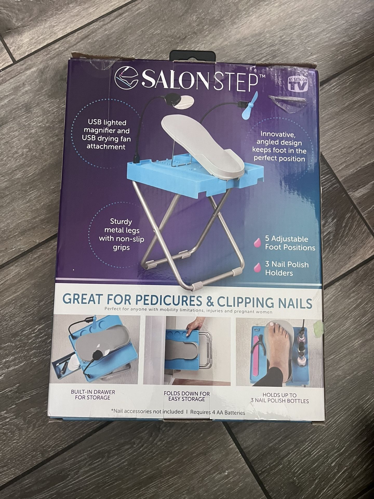 Includes LED magnifier, drying fan, adjustable door rest, non-slip sturdy legs and built in storage. Walmart has it listed for $40 Like new- used only once!