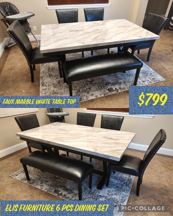 Brand New Dining Set Table, 4 Chairs & Bench White Faux Marble Black Faux Leather $799 + Tax Elis Furniture FREE LOCAL DELIVERY ELIS FURNITURE NEW LOCATION YUCAIPA 3 MONTHS SAME AS CASH FINANCING